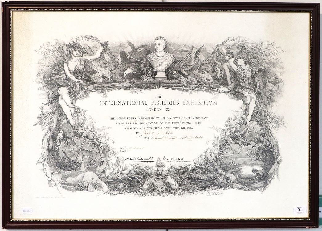 Also garnering much interest were three lots relating to the 1883 International Fisheries Exhibition, which was held in London to much acclaim. To that date, it was the largest specialist event with 2.6m visitors over the six months it was open. The scientific and cultural display saw a wide variety of exhibitors relating to all things fish and fishing, with a vast central aquarium, salt and fresh water tanks, and aviary with fish-eating birds and much more. The lots comprised a Gilt Metal Badge (sold for £750), a Silver Medal (sold for £650), and a Diploma Award for a Silver Medal awarded to Forrest and Sons for their exhibition of fishing tackle (sold for £750).