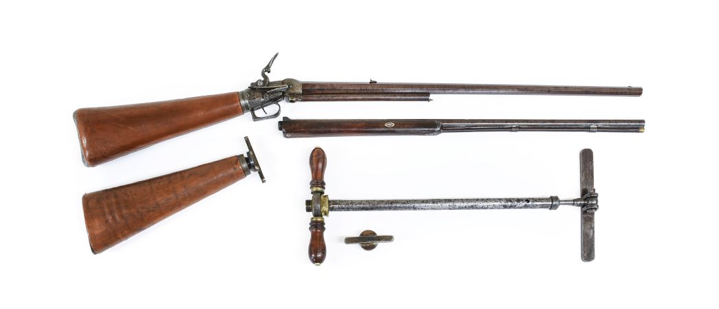 Notable, too is a rare Early 19th Century Repeating Air Rifle/Shotgun by Staudenmayer, London, 1802 (estimate: £3,500-4,500), and a Collection of Helmet Plates and Badges to the Northumberland Fusiliers.