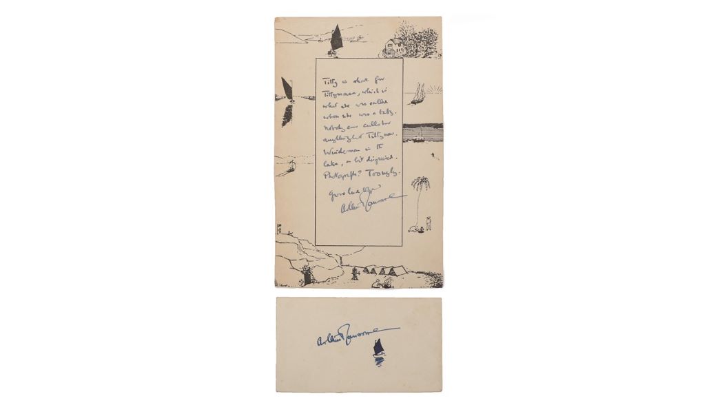 A further lot from the collection of Miss Joyce Cartmell is a signed note from Arthur Ransome on notepaper printed around the margins with illustrations from Ransome’s Swallows and Amazons books. The note explains that ‘Titty is short for Tittymouse which is what she was called when she was a baby. Nobody ever calls her anything but Titty now’, and that ‘Windermere is the lake, a bit disguised’. It appears he has been asked for a photograph, to which he responds, ‘Too ugly’. The note is sold in the original envelope addressed to Cartmell, postmarked 1939, and accompanied by a small card signed by Ransome with a pen and ink sketch of a sailing boat which has been taken from her autograph book described above. The lot is sold with an estimate of £1,000-1,500.