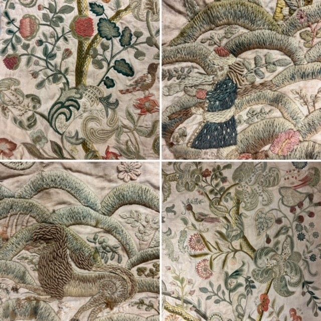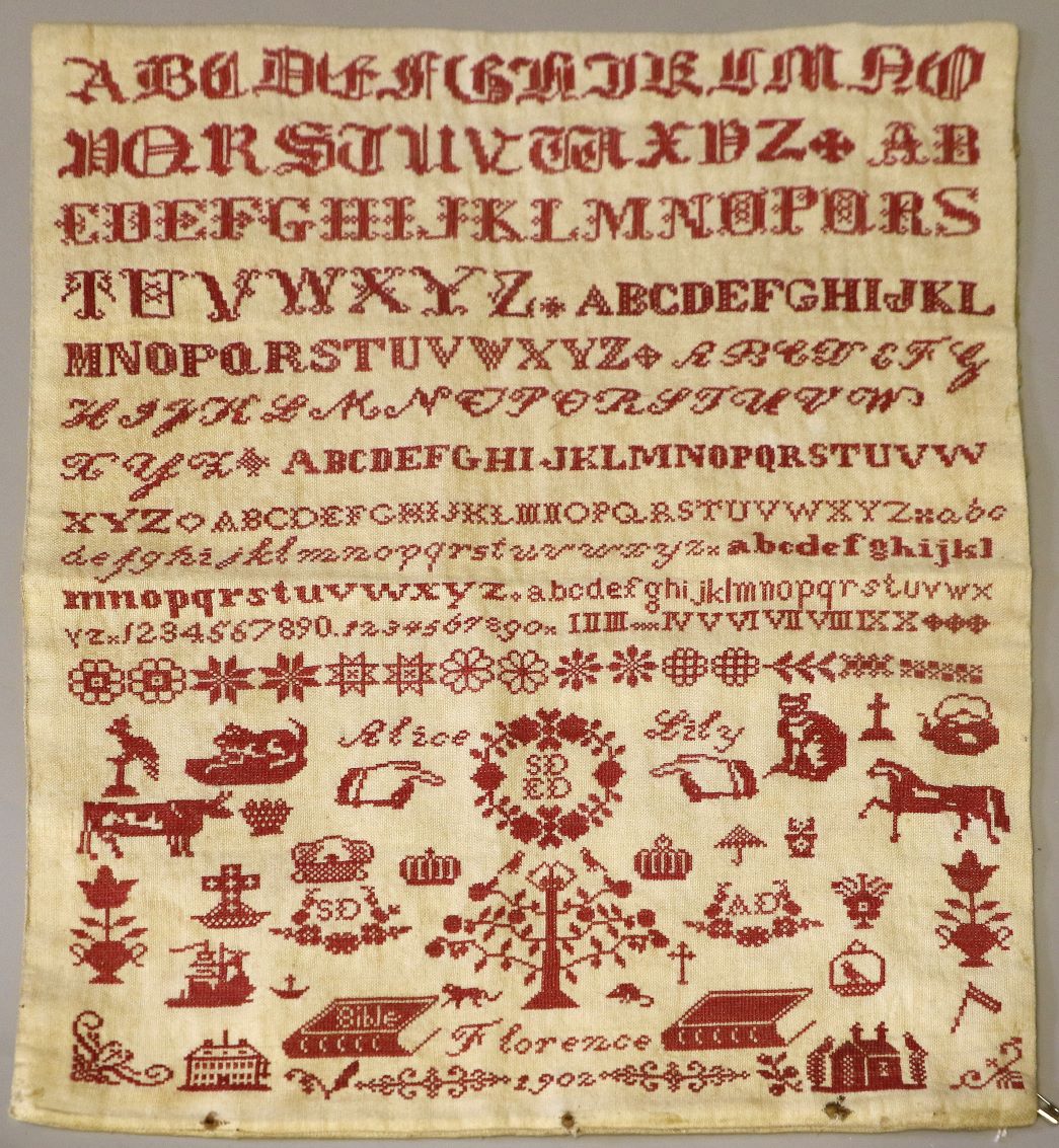 Ashley Down House was an extraordinary institution. At a time when there were very few orphanages, George Müller (b. Prussia 1805), a Christian preacher, built a vast orphanage that would care for over 10,000 children in his lifetime. Müller, a reformed ne’er-do-well, never asked any individuals or organisations for donations, instead he put his faith in the power of prayer, and donations flooded in. It is estimated that he received nearly £1.5m in donations (approximately £80m in today’s money). Müller gave his charges an education well beyond what was expected at the time and made sure they had an apprenticeship, a trade or a good household position to go to before they left. Sewing was a vital skill taught at Ashley Down, and the Bristol and District Teachers Association created the Needlework Scheme, a comprehensive education in the skills that would render the girls employable. Samplers were produced as examples of their abilities, to show potential employers. They followed a model sampler, with red cotton on linen, working the alphabet in different fonts at the top and personalising the bottom with motifs of their own.