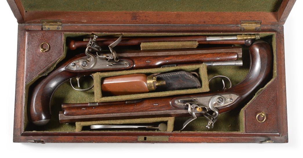 The present pair date from the years of partnership between Wogdon and Barton (both names are signed on the guns). The .28 bore pistols are cased in the original mahogany case, with fitted interior and accessories including a copper pistol flask, a steel bullet mould and leather flint bag.