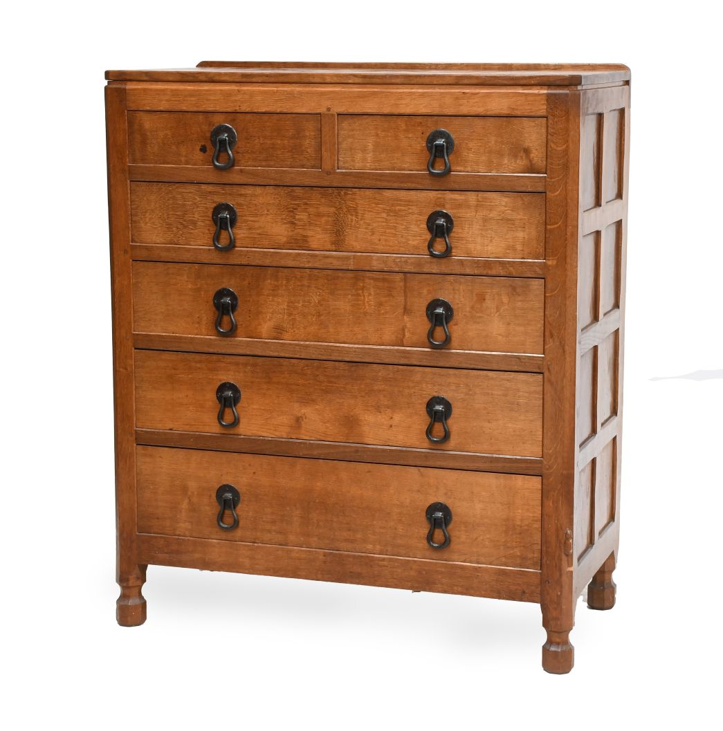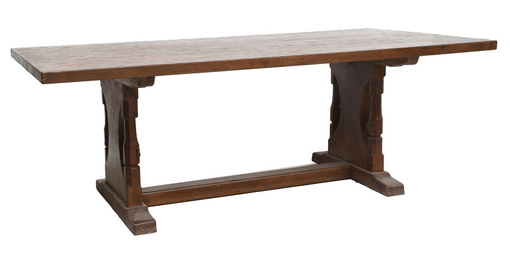 Amongst a wide range of furniture and furnishings by Yorkshire icon Robert ‘Mouseman’ Thompson and his workshop is an impressive English Oak 7ft Refectory Table, made in 1932 having been commissioned by King’s College at the University of Aberdeen. Indeed, the college’s Coat of Arms is painted on one of the table supports. The table was removed from the Taylor Library in 1995 due to modernisation and building work, and it is now offered for sale with an estimate of £5,500-6,500. Also of interest is a good English Oak Chest of Drawers dating from the 1940s/50s (estimate: £3,000-5,000). A wide range of furniture by the other Yorkshire Critter carvers is also up for auction, with pieces by the likes of Squirrelman, Wrenman, Beaverman and Gnomeman.