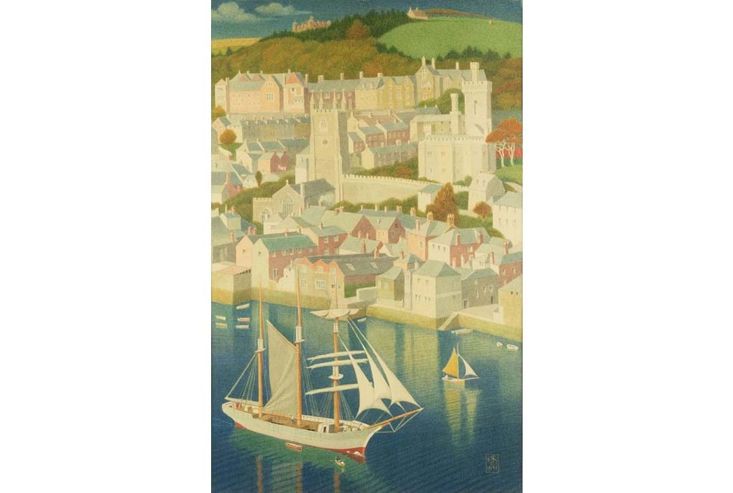 A charming and dream-like depiction of Fowey in Cornwall by Joseph Southall (1861-1944) is being sold by Ackworth School in Pontefract, the artist’s alma mater, to benefit and enhance the experience of pupils at the school with special educational needs. The painting had been given to the school by Eleanor Crosland, a fellow scholar, who had studied there at the end of the 19th century. Fowey Harbour with White Barque will be sold with an estimate of £8,000-12,000 (all figures exclude buyer’s premium), in Tennants Auctioneers’ British, European & Sporting Art Sale on 12th July. Southall was a devoted Quaker and vocal pacifist, who vigorously campaigned for peace throughout the First World War. Post-war, he and his wife travelled widely in Europe and along the South Coast, inspiring his engaging paintings. Having studied at Birmingham School of Art, he was part of the Birmingham Group of artists who were inspired by the ethos of Arts and Crafts luminaries John Ruskin and William Morris.