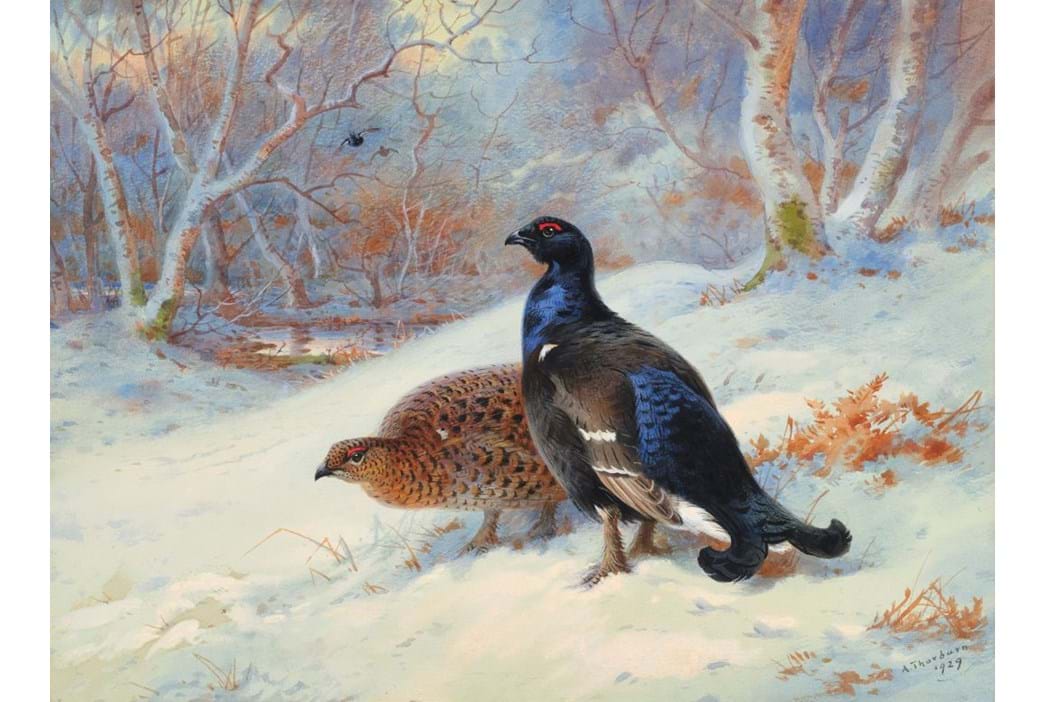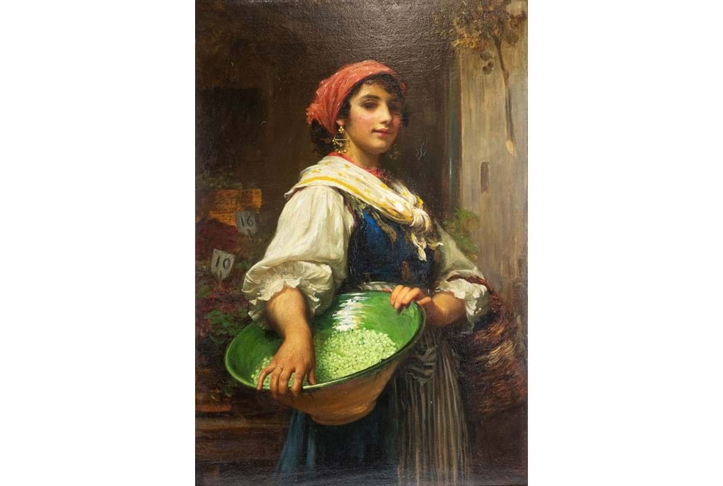 From other vendors in the sale is a very fine example of the work of the notable sporting artist Archibald Thorburn (1860-1935), who depicted birds with great accuracy and naturalism. Blackgame in Snow, signed and dated 1929, is being sold from a private collection in Buckinghamshire, and is offered with an estimate of £8,000-12,000. Amongst a good selection of 19th century British and Continental paintings are “Meditation” by Charles Spencelayh (1865-1958) from a private collection in North Yorkshire (estimate: £7,000-10,000), and A Venetian Vegetable Seller by Sir Samuel Luke Fildes (1843-1927), which is sold with provenance from the Sale of Wiganthorpe Hall, York in the early 1950s with an estimate of £3,000-5,000.