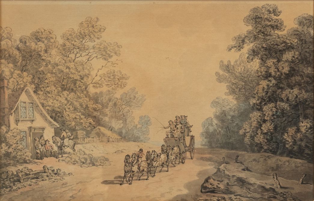 Traditional and sporting art in the sale includes a good range of portraits, landscapes and interesting genre paintings, including an intriguing 18th century English School Naval Figures Before a Coastline and Landscape with Castle, with provenance from the Estate of the Late Lord Lloyd of Berwick (1929-2024) (estimate: £800-1,200). From the same estate is “A Coach and Six” by Thomas Rowlandson (1756-1827) (estimate: £300-400), and from the Court House, Bolton by Boland and by repute from the collection of Sir Samuel Hoare is a Still Life of Roses, Variegated Tulips, Auricula and Narcissus by a Follower of Franz Xaver Petter (179101866) (estimate: £200-300). A further highlight is Milking Time by Hamilton Jay (fl.1875-1913) (estimate: £500-700). Amongst the sporting pictures is a Black Labrador Searching out Pheasant by John Trickett (b.1953) (estimate: £700-1,000).
