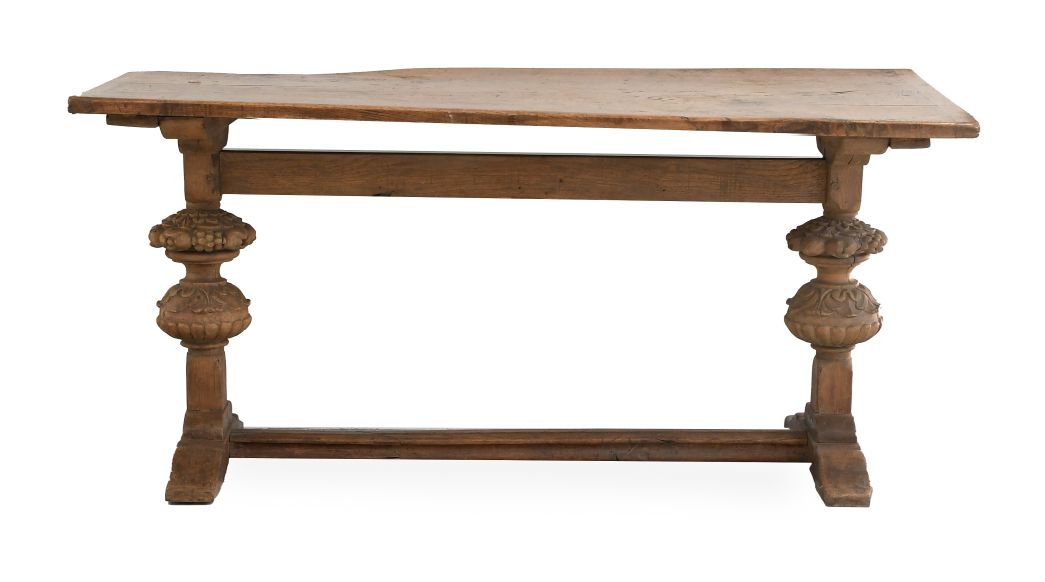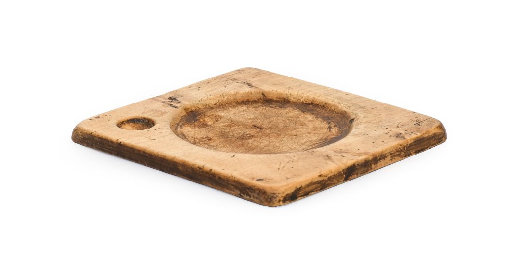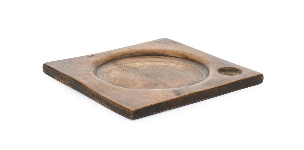 The sale also offers two rare 17th or 18th century wooden trenchers, an early form of tableware in common use from the Medieval period. The trencher was initially just a thick slice of coarse bread, onto which food from a central dish would be spooned but were later made from wood and for wealthier households pewter or precious metal. Wooden trenchers continued to be used by poorer families into the 19th century. Given the utilitarian nature of the items, they were usually disposed of when no longer needed and rarely come up at auction. The two present examples are square shaped turned wood with a central depression for food, and a separate dimple for salt; the larger is offered with an estimate of £200-300, and the smaller with an estimate of £150-200.