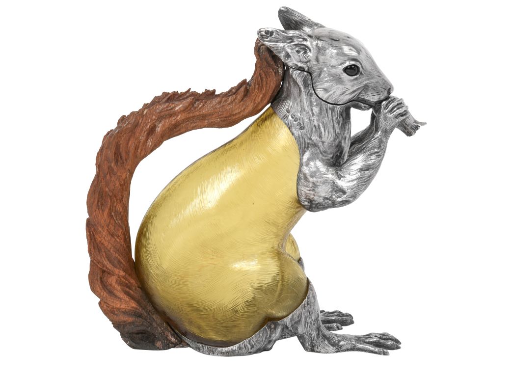 An extraordinary Victorian Silver-Mounted Green or Amber Glass Claret-Jug in the Form of a Squirrel is one of the rarest lots coming up in the Jewellery, Watches and Silver Sale on 17th May (estimate: £5,000-8,000 plus buyer’s premium). This charming piece was made in 1882 by Alexander Crichton, a Scottish silversmith who found fame creating whimsical novelty silver-mounted claret-jugs and scent-bottles in forms such as dodo, a walrus, and a crocodile. He worked in partnership with fellow silversmith Charles John Curry from a base in Oxford Street, London, but the production of these claret-jugs was to be very short lived, with most of the known extant examples dating to 1881 or 1882. The squirrel is amongst the rarest form of these claret-jugs, with only two examples recorded; one with a silver tail that was previously owned by Her Majesty Queen Elizabeth, the Queen Mother, and an example sold at Sotheby’s, Belgravia in November 1977. It is thought that the present example and the one sold in 1977 are likely one and the same, the vendor’s family having added to their collections in that decade.