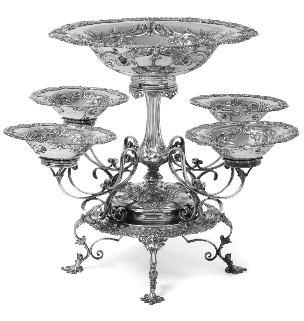 Pieces by notable makers in the sale include an Edward VII Silver Epergne by James Dixon and Sons of Sheffield 1906 (estimate: £6,000-8,000), a George IV Silver Meat Dish by Paul Storr of London, 1829 (estimate: £2,000-3,000), and an Art Nouveau Victorian Silver Tray by William George Connell of London, 1900 (estimate: £1,200-1,800). Also included in the sale is an interesting George V Silver Bowl by Mappin and Webb of London 1913, inspired by the 8th/9th century Irish Ardagh chalice and awarded as the Lancashire and Yorkshire Post Office Football Challenge Cup in 1914 (estimate: £1,000-1,500), a large Elizabeth II Silver Model of a Royal Stag and Deer by Camelot Silverware Ltd after a model by Tom Mackie (estimate: £700-1,000), and an Elizabeth II Silver Table Service by Viners of Sheffield designed by Gerald Benney (estimate: £2,000-3,000).