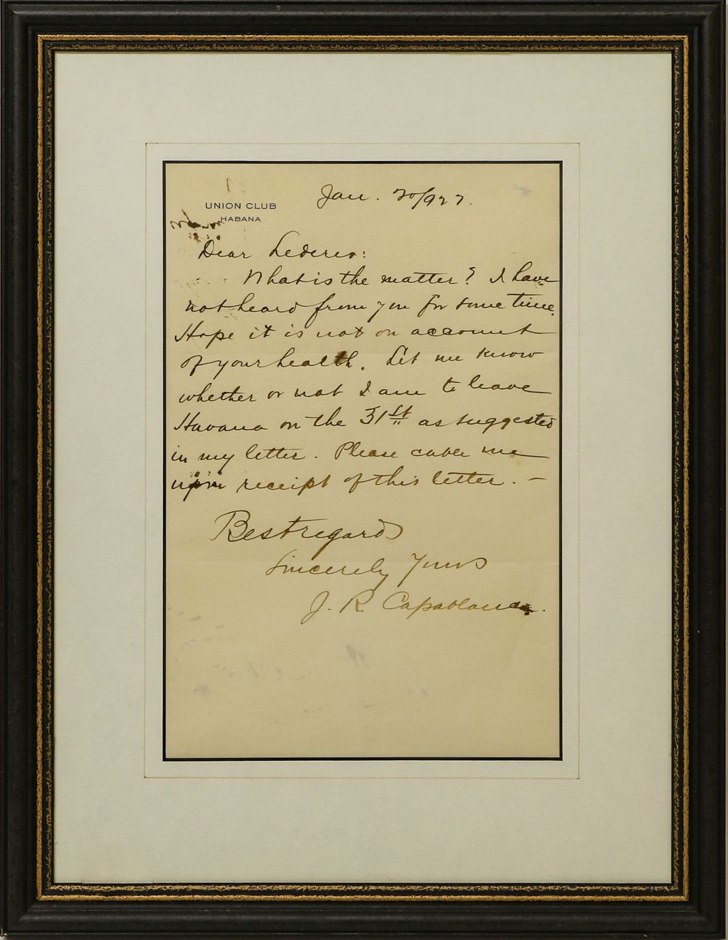 Amongst the ephemera in the sale is a handwritten letter from José Raul Capablanca (1888-1942), a Cuban chess prodigy who reigned as World Chess Champion from 1921 to 1927 and was renowned for his endgame skills and speed of play. The letter was written to Dr N L Lederer on 20th January 1927 and reads: “Dear Lederer, What is the matter? I have not heard from you for some time. Hope it is not your health. Let me know whether or not I am to leave Havana on the 31st as suggested in my letter. Please cable me upon receipt of this letter. Best Regards J R Capablanca’. It is likely this letter refers to Capablanca travelling to the New York Chess Tournament, for which Lederer was the secretary of the tournament committee. The elite tournament was held in the lavish surroundings of the Hotel, Manhattan Square from 19th February to 23rd March, and Capablanca came out the winner. The framed letter will be sold with an estimate of £400-600.
