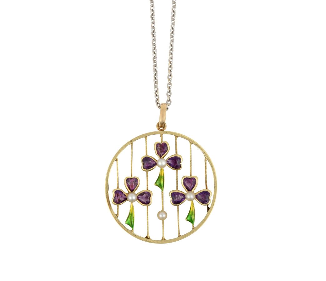 A varied offering of affordable and wearable jewellery includes good period pieces alongside modern designer items. Amongst the interesting antique pieces is an Early 20th Century Suffragette Pendant on Chain, with amethyst, pearl and green enamel representing the suffragette colours (estimate: £200-300), a circa 1900 Sapphire and Diamond Bracelet (estimate: £600-800), an Early 20th Century Amethyst and Split Pearl Necklace (estimate: £200-300), and a Mid-Victorian Enamel and Garnet Brooch (estimate: £200-300). Moving into the 20th century, an 18 Carat White Gold Garnet and Diamond Cluster Ring is offered with an estimate of £600-800, and a Pair of Emerald and Diamond Cluster Earrings with an estimate of £400-600. Finally, amongst the more contemporary pieces is an 18 Carat Gold Necklace by Fope (estimate: £1,200-1,800), a Diamond Heart Brooch (£400-600), and an Amethyst and Diamond Ring (estimate: £400-600).