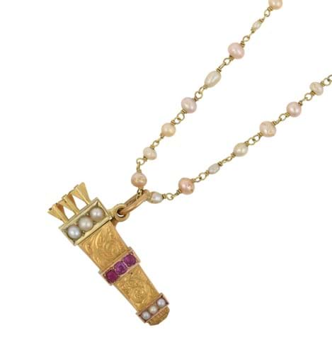 Following on is a Ruby and Split Pearl Pendant on Chain in the form of a quiver and arrows; by association with Cupid it is a marginally more discreet message of love, but one that still speaks volumes as to romance and devotion (estimate: £300-500). The quiver is exquisitely made and opens to reveal four dressmaking pins to make it both fashionable and functional.