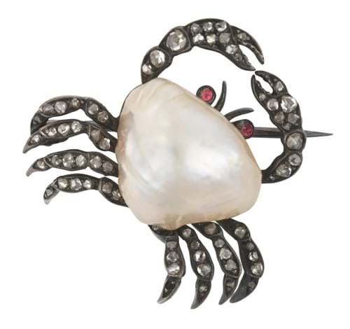 Intriguing and sometimes macabre animal and insect motifs in Victorian jewellery are familiar to fans of the era, which were often used to inject humour or to shock - jewelled spiders, flies and salamanders are amusing, but not rare. Crabs, on the other hand, are not prolific in the antique jewellery market. A circa 1860 Pearl, Diamond and Ruby Brooch in the form of a crab is set with a baroque pearl to the body, diamonds to the legs and pincers, and ruby eyes (estimate: £200-400). Despite his slightly angry appearance, he is most entertaining. Maybe intended to represent the sign of the zodiac, a tough-shelled crab could also represent strength, resilience, protection or in an even quirkier way a lover of the sea.