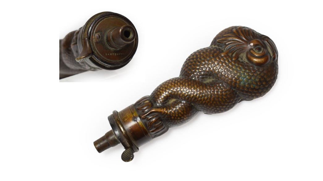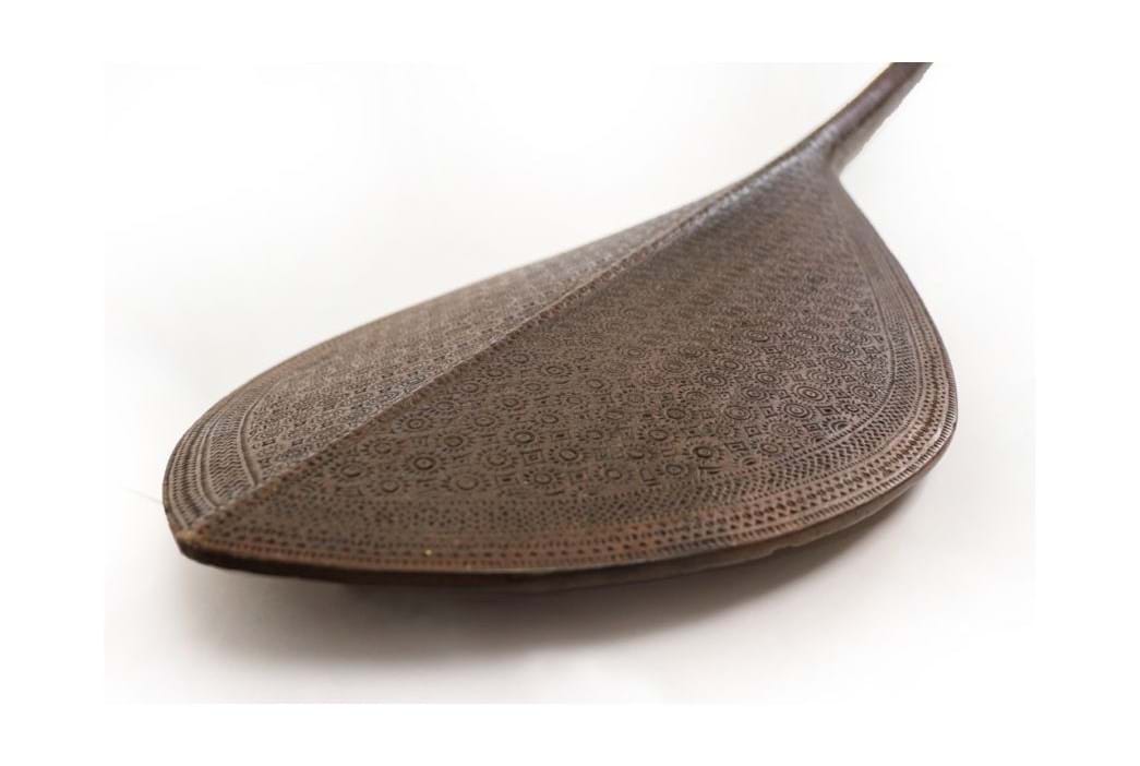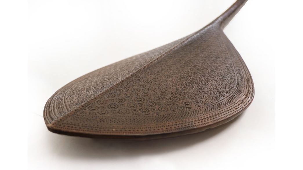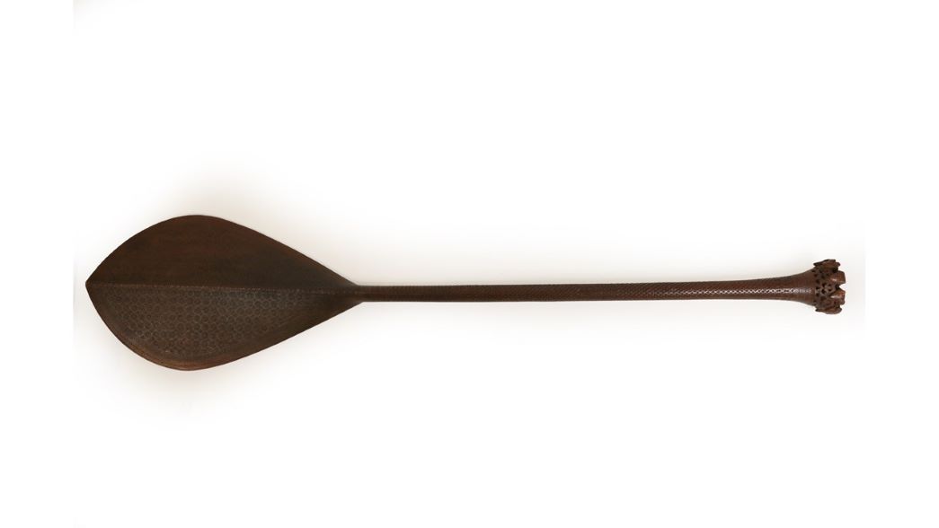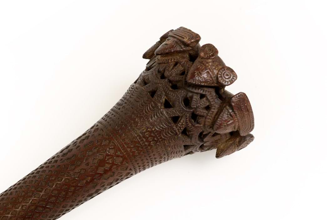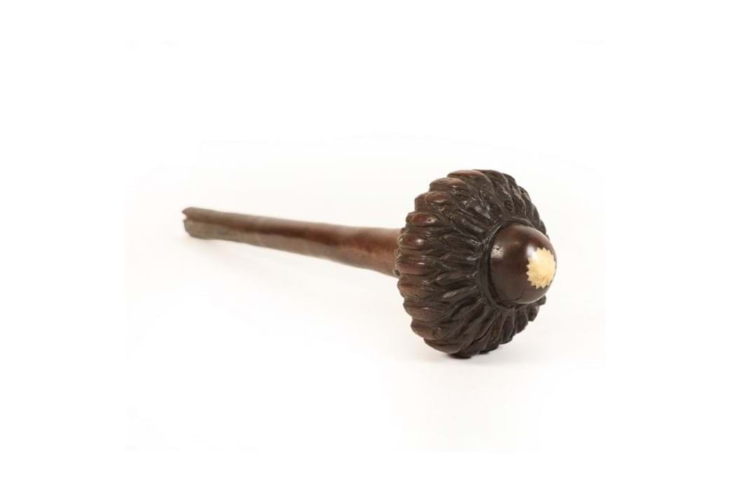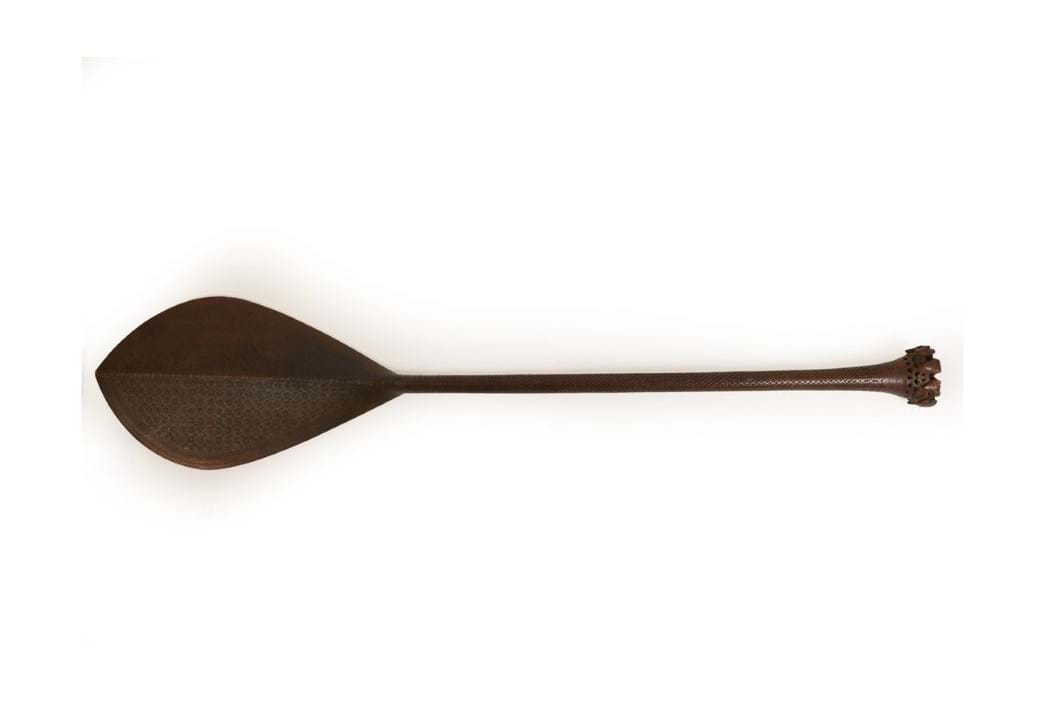 A 19th century wooden paddle from the Austral Islands covered with intricately carved decorative motifs is set to be one of the highlights of Tennants Auctioneers’ Militaria and Ethnographica Sale on 30th June. The Austral Islands are the southernmost group of islands in French Polynesia, and such paddles were traded with Europeans who visited the islands on whaling ships during the first half of the century; it has been conjectured that they developed from earlier ceremonial paddles. The paddle is highly decorated, with crisply-carved repeating motifs including ‘toothed suns’, which comprise concentric circles surrounded by ‘niho’ or triangular teeth, a feature prominent in Austral Islands carving. Indeed, many such paddles would have been carved using sharks’ teeth. The pommel at the top of the shaft is encircled by stylised figures wearing alternating headdresses, and the paddle is offered with an estimate of £2,500-3,500 plus buyer’s premium.