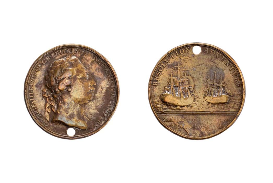 James Cook sailed from Plymouth on 13th July 1772 aboard HMS Resolution, alongside the companion ship HMS Adventure, under instruction to circumnavigate the globe as far south as possible in search of ‘Terra Australis Incognita’, a rumoured landmass to the south of Australia. Cook carried with him two thousand medals – now known as Resolution and Adventure medals – that had been commissioned by the British Admiralty to present to or barter with indigenous people encountered on the voyage. In addition, the medals were given out as favours to sailors during the voyage, and the remaining medals were taken on Cook’s Third Voyage. The medals were made from platina, an alloy of brass, copper, lead, tin and antimony, and had a bust of King George III on the obverse and a depiction of the Resolution and Adventure on the reverse. A hanging loop was drilled into the rim at the top so the medal could be suspended by a ribbon from the neck. Indeed, the side featuring the king is often found to be better preserved, as the medals were worn with the monarch facing outwards, leading to rubbing to the reverse.
