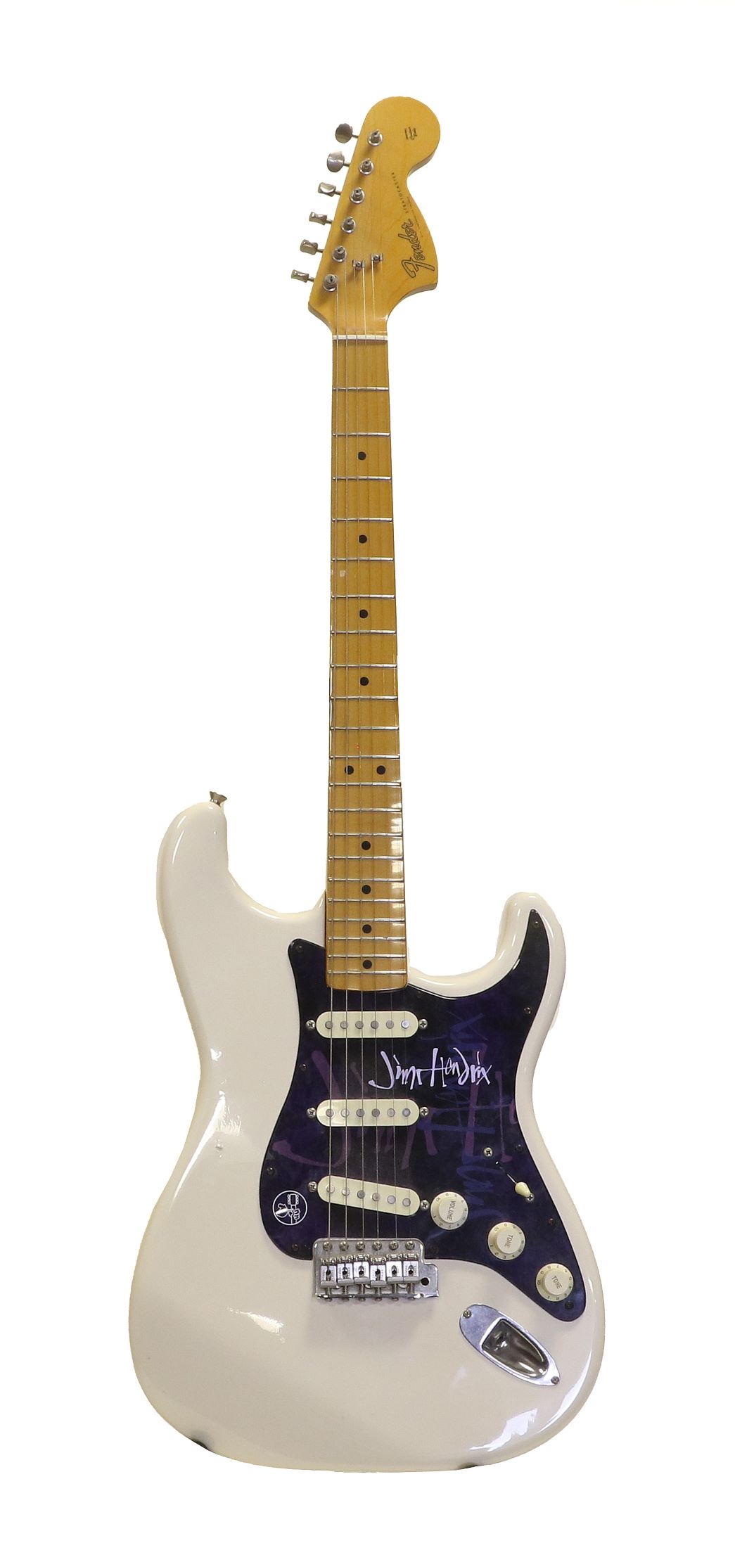 A further guitar of note in the sale is a Jimi Hendrix Woodstock 25th Anniversary Guitar, Number 1 of a limited edition of 26 (estimate: £1,000-1,500). Made in 1994 to celebrate the anniversary of Hendrix’s legendary Woodstock appearance, this Fender is a re-issue of the 1968 Fender right-handed guitar, which Hendrix played at Woodstock, strung for a left-handed player but held upside down by Hendrix in his idiosyncratic manner. Adorned with a facsimile of Hendrix’s signature and engraved 'Polygram Jimi Hendrix Woodstock 25th Anniversary 1994 01/26', the guitar is sold with certificate, photographs, tremolo arm plectrums and an inspection card.