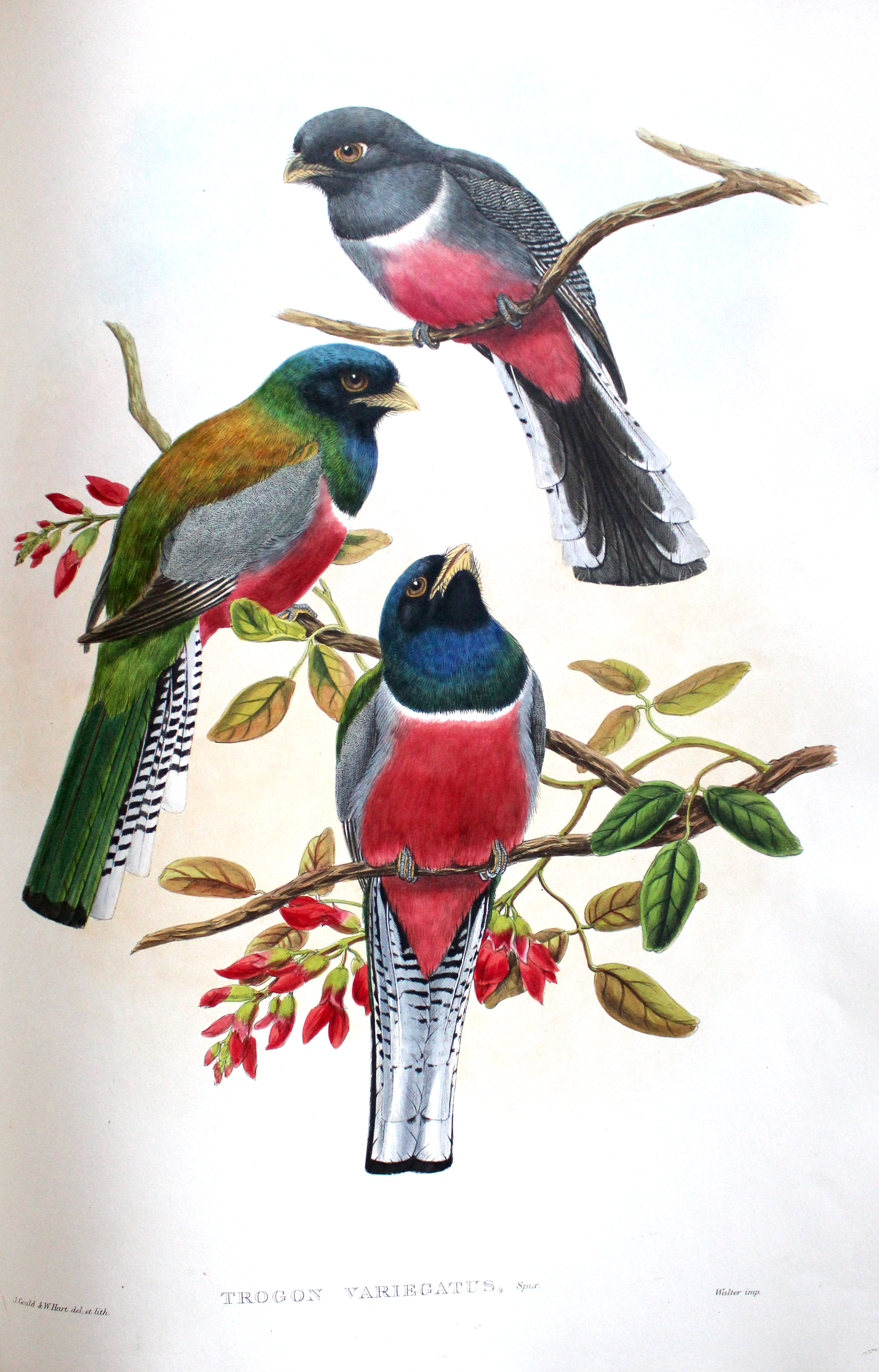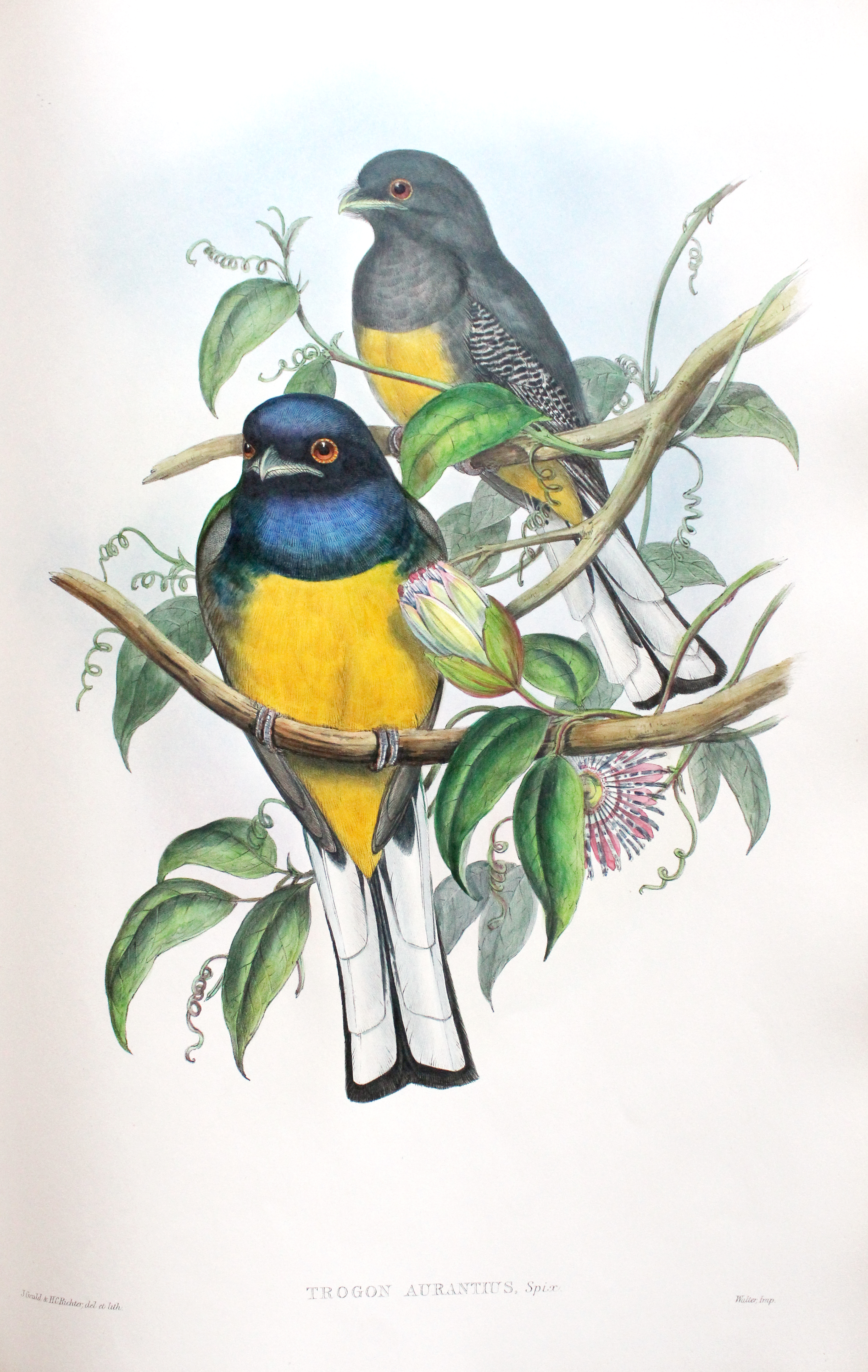From lowly beginnings, John Gould (1804-1881) became the most celebrated British ornithologist of the 19th century, contributing enormously to ornithology and evolutionary science whilst amassing a personal fortune through his self-published and now highly prized folios. Having worked first as a gardener, and then as a taxidermist, Gould went on to publish an extraordinary forty-one folios with over 3000 plates, as well as writing numerous scientific papers. Gould would study, describe, and sketch the birds, before having his wife or later other artists such as Henry Constantine Richter, William Matthew Hart and Edward Lear complete the hand-coloured lithographs to his exact specifications. The illustrations were beautifully and carefully executed, artistic yet naturalistic depictions of birds set amongst appropriate foliage.