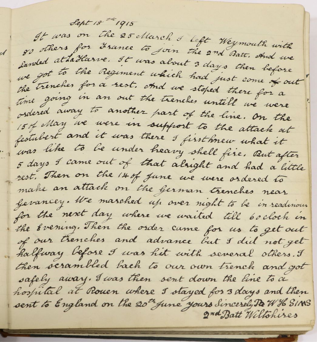 Also of note is a small family collection of manuscript books, with the earliest of the three volumes being a ‘Private Calendar’ with detailed diary entries from 1st January 1795 to 13th September 1802 (estimate: £150-250). The author was Stephen Wilson, a silk manufacturer who recorded his life around Hackney and Bethnal Green. The second volume is ‘In the Days of Old. A Quaker Child, by Granny’, written by Isabella Tylor (née Harris) for her grandchildren. The illustrated volume details her childhood in a ‘village near London’ – Stoke Newington – then a leafy village amongst the fields. She then moved to Mayfield in Sussex, before moving to Kensington where the book was written in 1893. Containing original watercolours, a birth certificate, photographs and family inscriptions, the volume is offered with an estimate of £300-500. Finally, there is a volume of manuscript memoirs of wounded soldiers at St. Mary’s War Hospital, Reigate between 1915 and 1916 (estimate: £150-250). Freda Meryon Chance, a V.A.D. at St. Mary’s Red Cross Hospital, encouraged the patients in her care to write accounts of their personal experiences in her notebook. There are 32 contributions, with several detailing action at the front and the circumstances which gave rise to their injuries and several drawings.