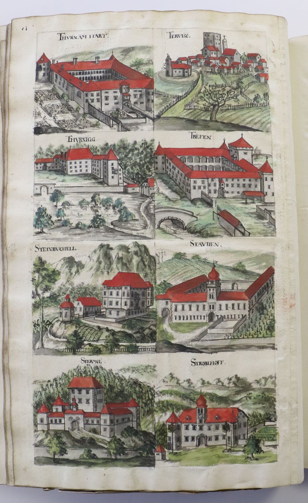 An outstanding album of early engravings, woodcuts and original artwork depicting the towns, castles, houses, monasteries and inhabitants of the Austrian Empire will be offered with an estimate of £2,000-4,000. Possibly compiled in the late 17th century, with illustrations thought to date from the 16th century onwards, the large folio album measures 56cm x 43cm and an early bookseller’s catalogue entry pasted in the front describes it as ‘A Noble Old Scrapbook’. It forms a fascinating record of the important buildings and towns of Austria, and it is divided in to four regions: Styria (South-East Austria), Carinthia (South Austria), Carniolia (Slovenia) and Tyrolis (Western Austria).