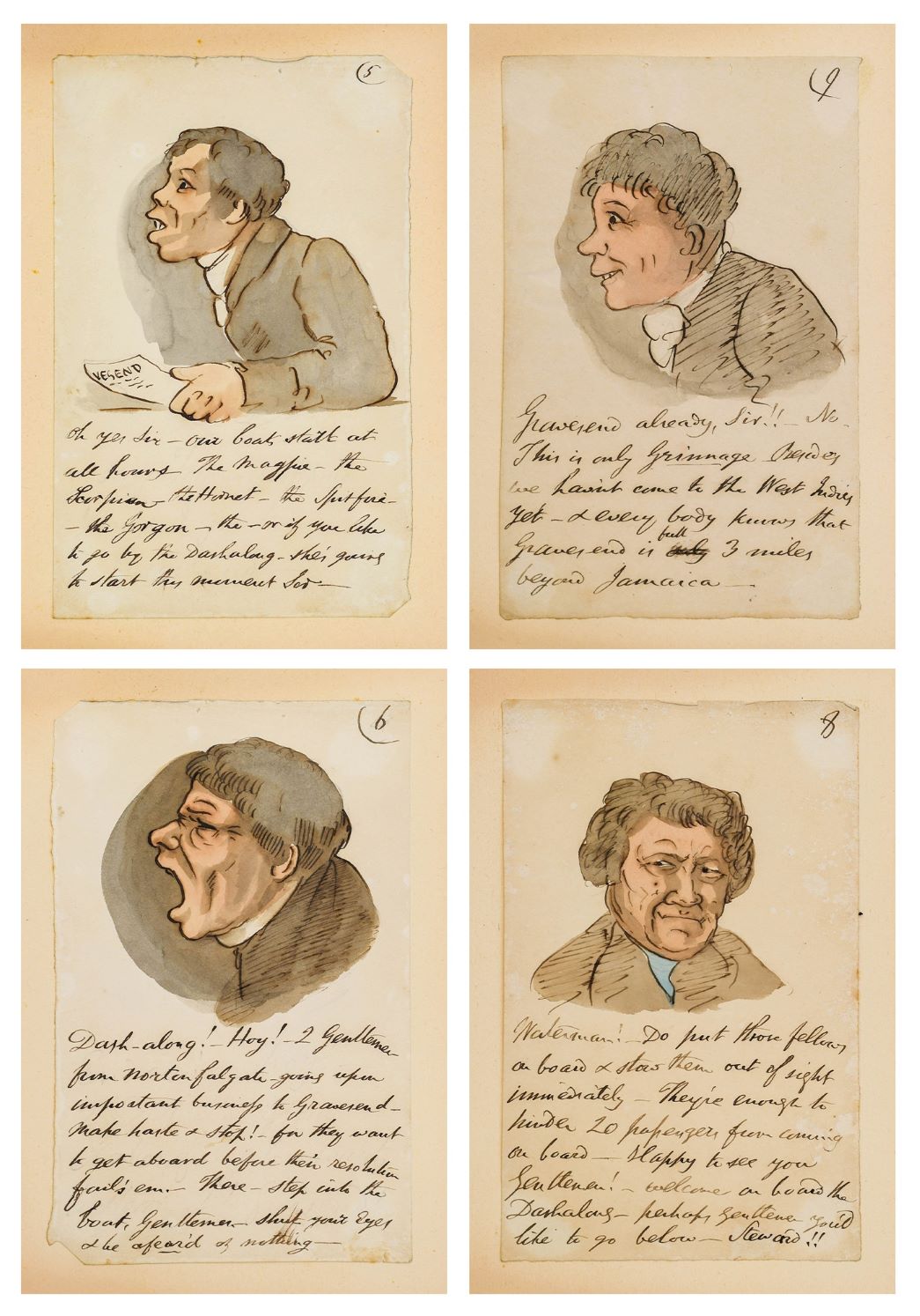 An interesting group of original artwork by Robert Browning Senior (1782-1866), father of the poet of the same name, sold well at £4,000, ten times the bottom estimate. Browning Sr. was sent to the West Indies after leaving school, to work on the plantations belonging to his mother’s family; however, the young man had artistic leanings and the harsh plantation life did not suit, so he returned to London where he became a clerk at the Bank on England. In London he delighted in drawing ‘grotesque’ style caricatures and portraits, often with witty remarks, including many of criminals he saw pass through the law courts of London. Many scholars have discussed the influence Browning Sr.’s grotesque art had on his son’s poetry.