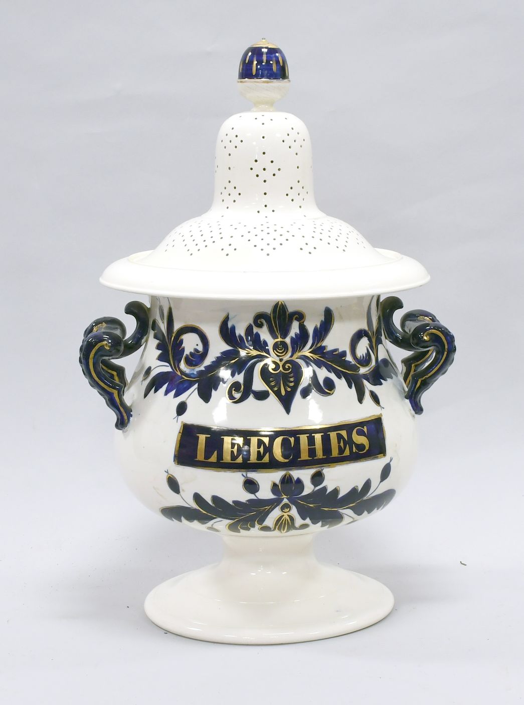 Leech jars continue to be popular decorative curiosities, and a good Staffordshire Pottery Pharmacy Leech Jar and Cover, made in the first half of the 19th century, sold for £1,700. The jar was impressed with the stamp of M. Tomlinson, Hulme, which was listed in an 1852 historic trade directory under “Plaster Spreaders, and Dealers in Druggists, Sundries”.