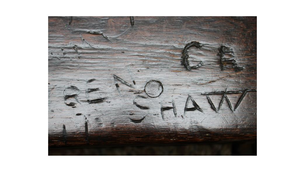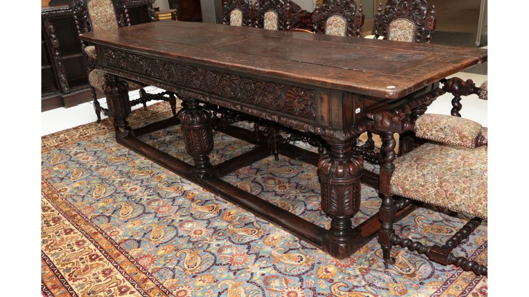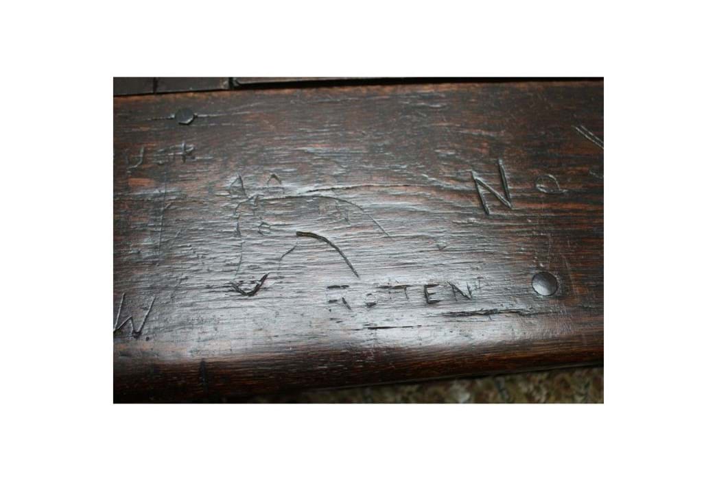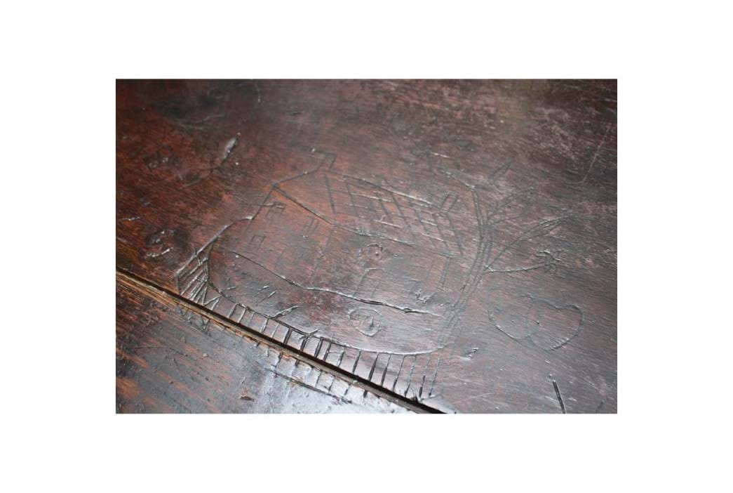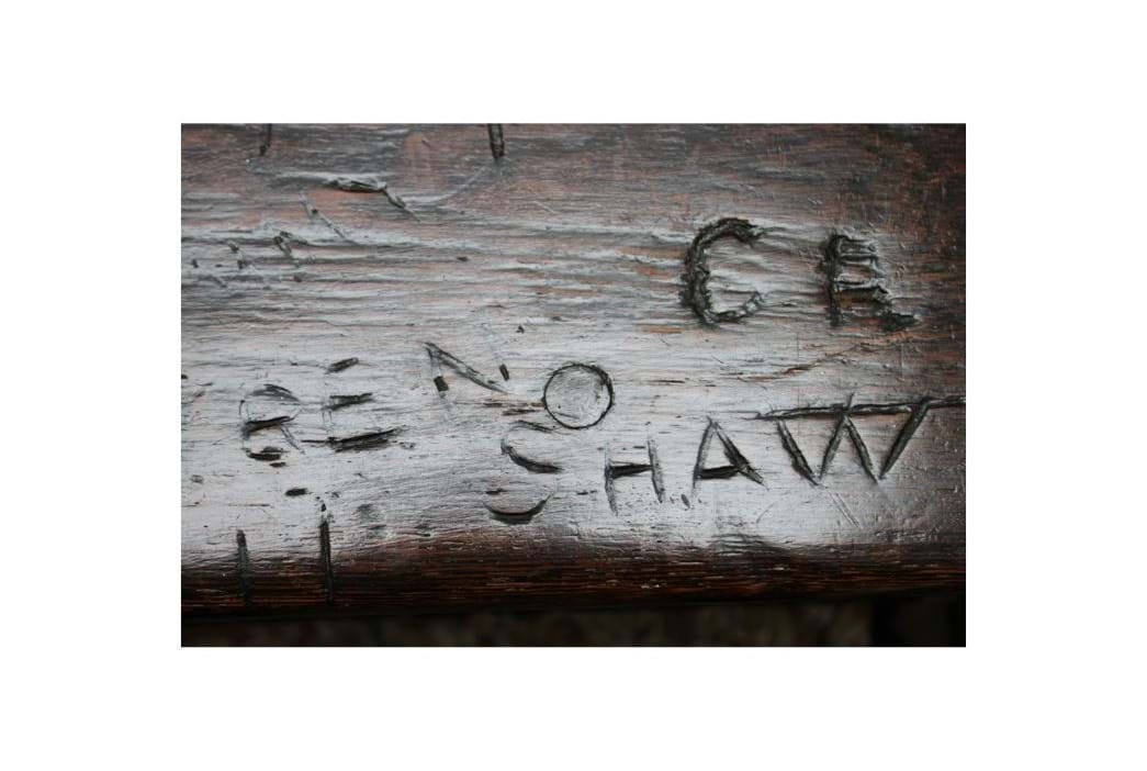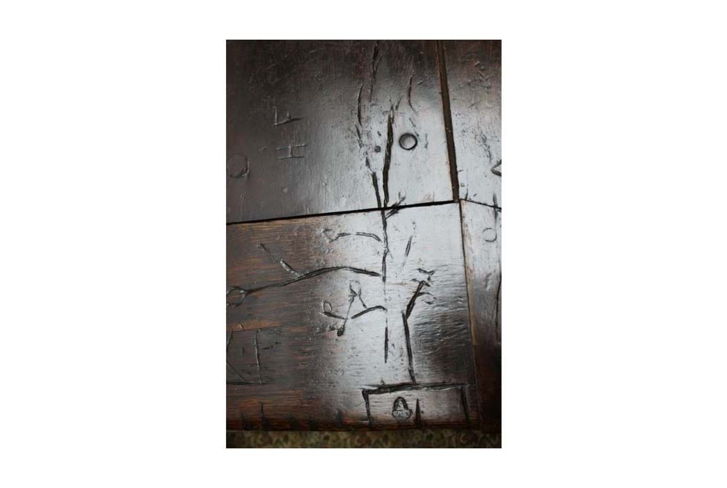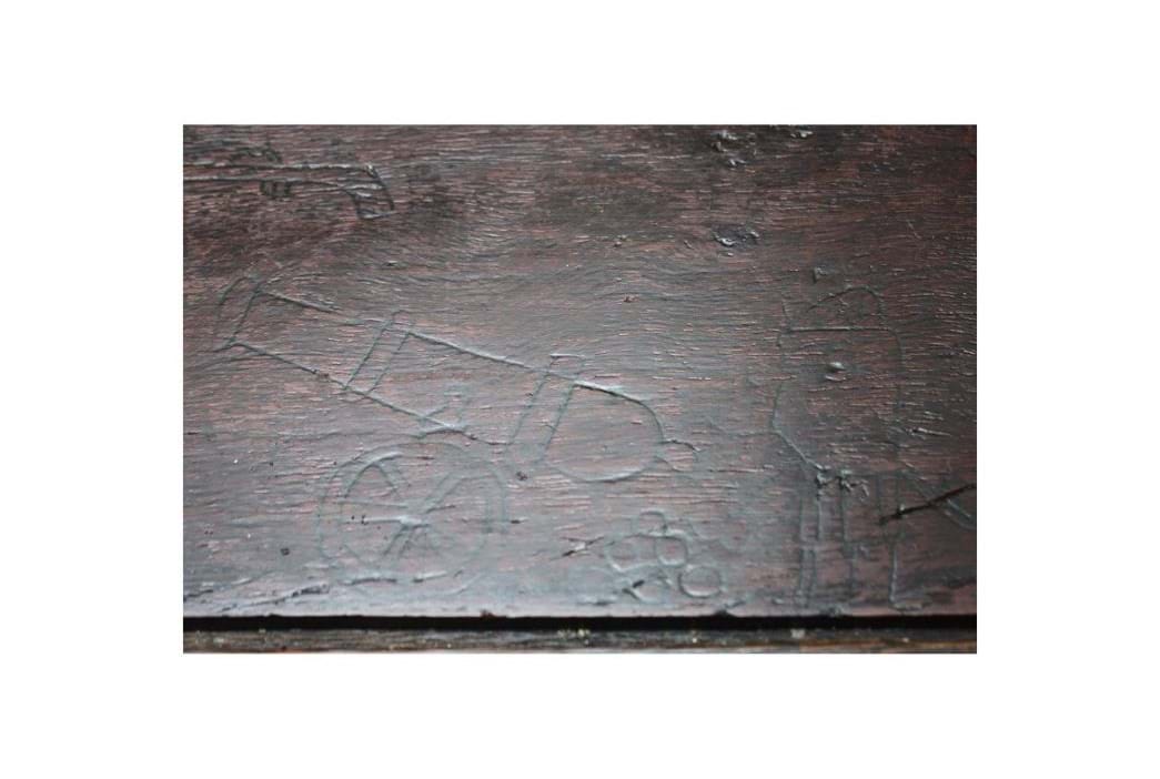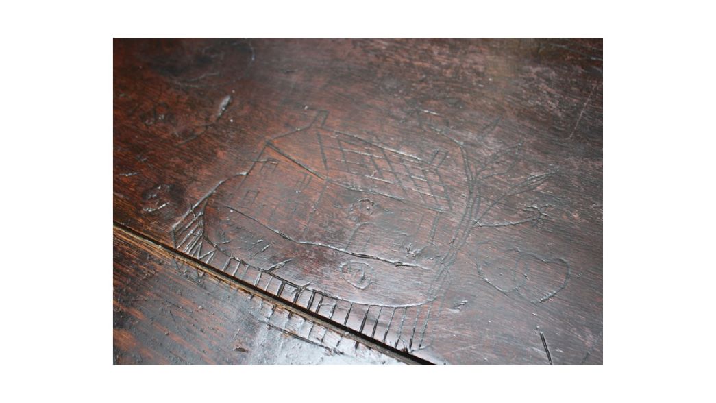 The Elizabethan table, which has a later top, was in a family collection in Dimple Hall East, Egerton, Lancashire for over forty years. Prior to that, by repute, it was housed in a private school in the south of Ireland. Its life as a school room table is evident in all the fascinating childhood carvings scattered across the top.
