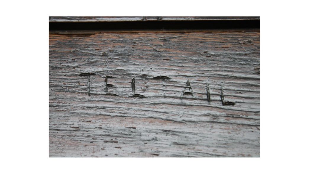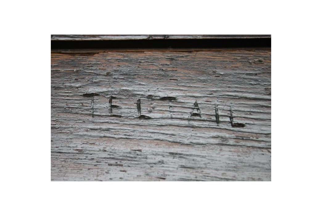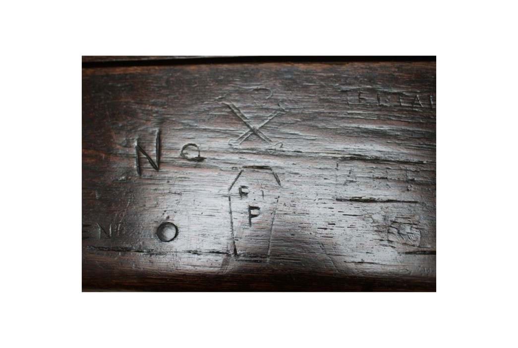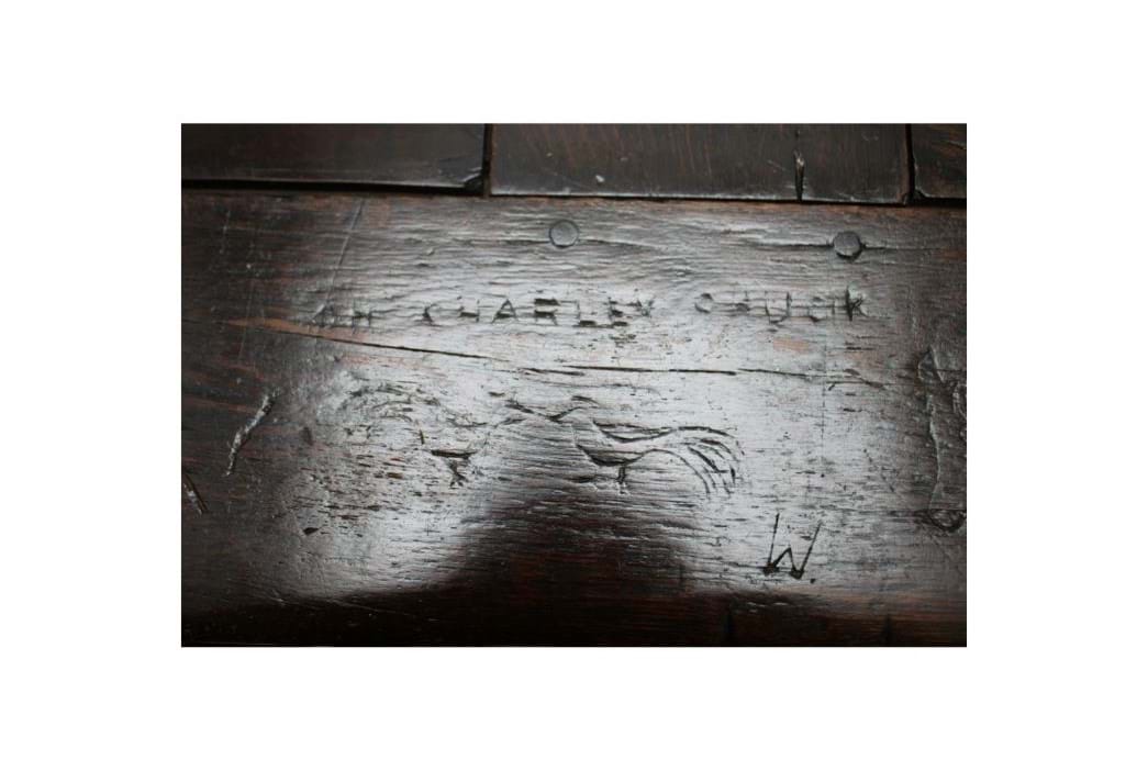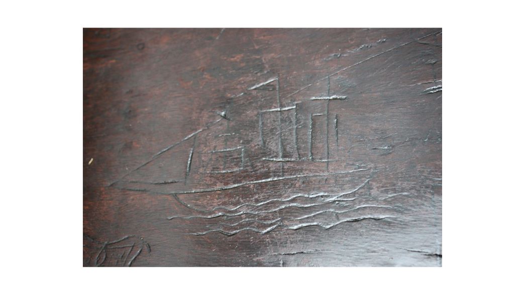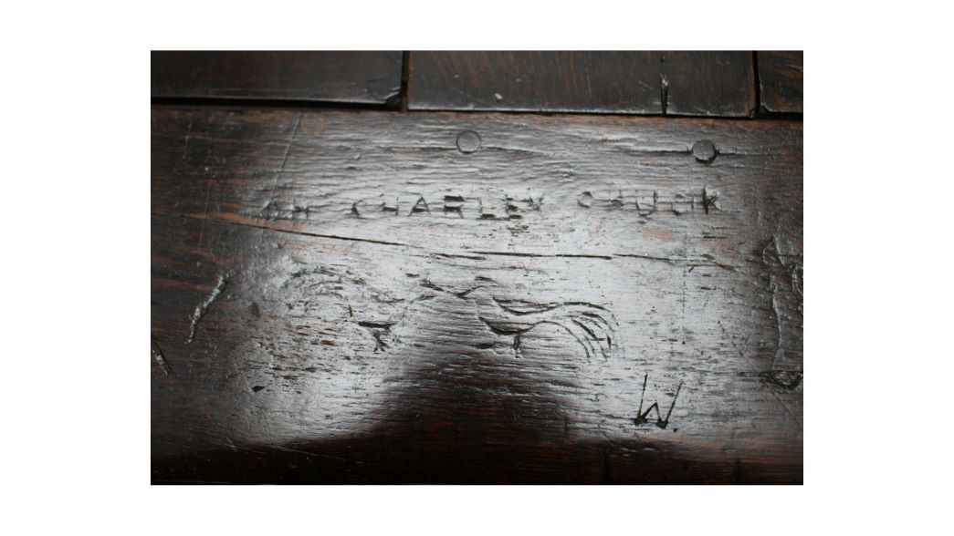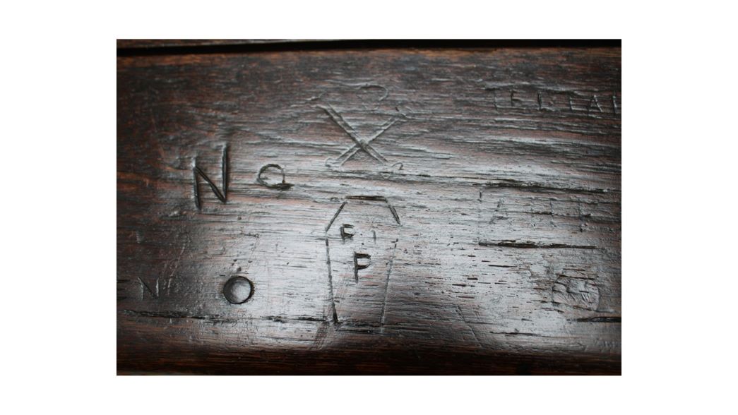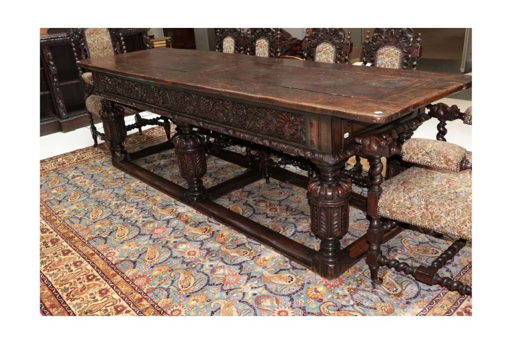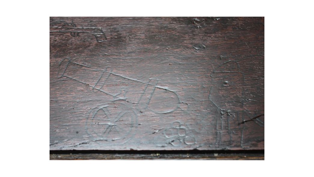The Elizabethan table, which has a later top, was in a family collection in Dimple Hall East, Egerton, Lancashire for over forty years. Prior to that, by repute, it was housed in a private school in the south of Ireland. Its life as a school room table is evident in all the fascinating childhood carvings scattered across the top.