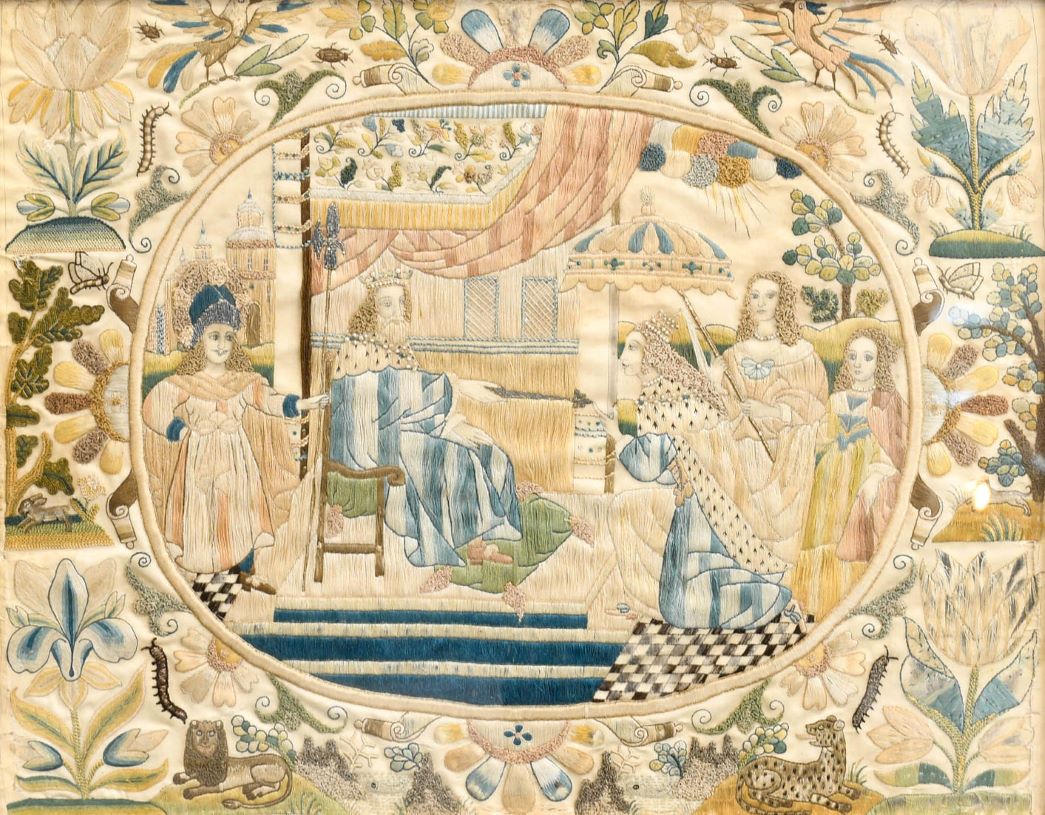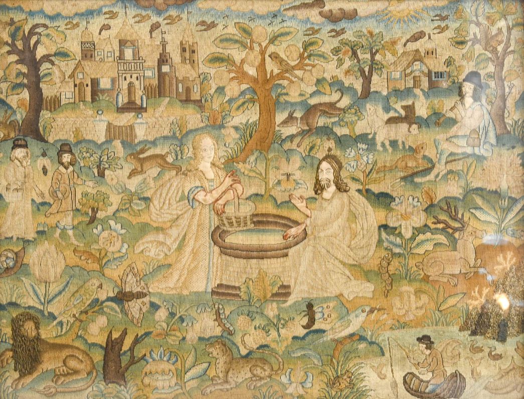 Highlights from other vendors in the sale include a Private Collection of 17th Century Needlework. Amongst the nine works on offer is a mid-17th century needlework picture depicting Rebekah and Isaac at the well (estimate: £3,000-5,000 plus buyer’s premium). Worked in coloured threads, the central figures are surrounded with animals and insects, trees, and a castle. Also of note is a circa 1660 picture of King Solomon and the Queen of Sheba, worked with coloured and metal threads and seed pearls (estimate: £2,000-3,000). Also hailing from the 17th century is an Aubusson Verdure Tapestry, made in Central France. The rural scene with birds and animals in a wooded landscape with buildings beyond is woven in silks and wool, and the tapestry is offered with an estimate of £2,000-3,000.