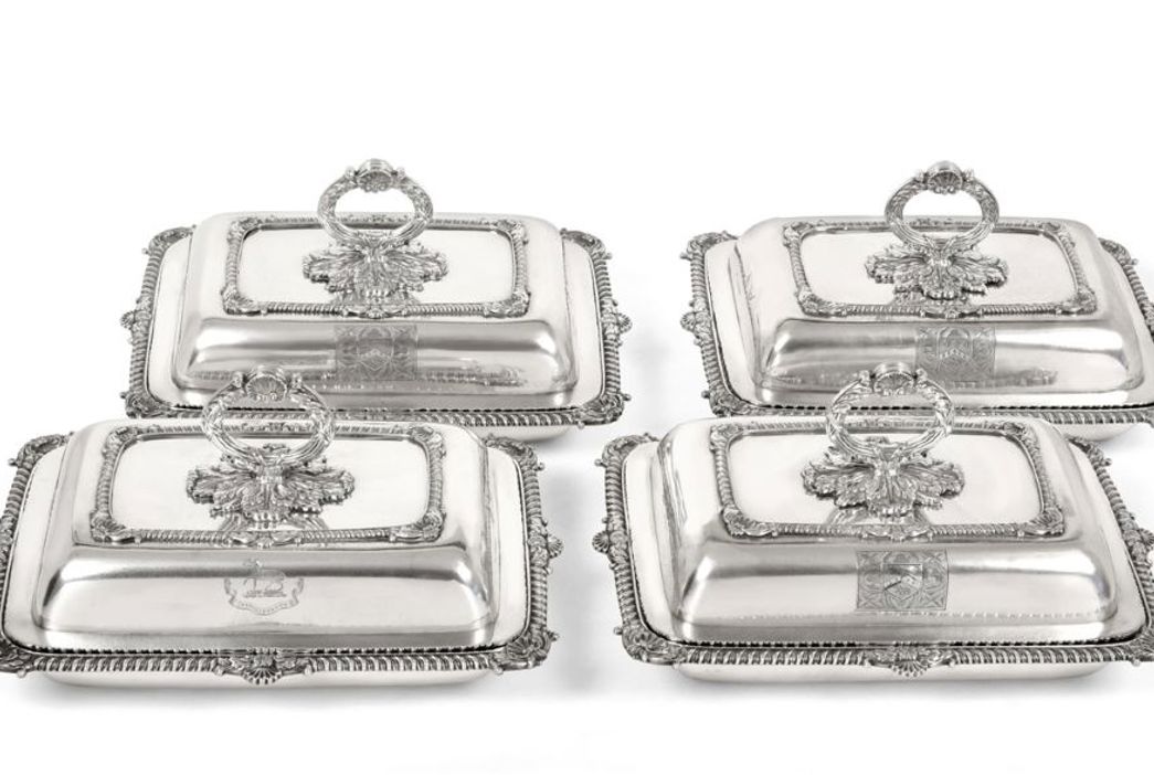 A good collection of silver is led by a set of four George III silver entrée dishes, probably made by William Stroud of London in 1816 (estimate: £5,000-8,000). Decorated with gadrooned borders and shell and acanthus leaf corners, the dishes are engraved with family crests and coats of arms. A strong selection of furniture is led by a fine George III satinwood and polychrome painted pedestal sofa table, painted with flower garlands and swags (estimate: £3,000-5,000), an ebonised, red tortoiseshell and brass-cut Bureau de Dame circa 1850 (estimate: £1,000-1,500) and a pair of French Louis XV style kingwood and giltwood metal mounted corner brackets (estimate: £2,000-3,000). Further highlights include a 19th century French ormolu six-branch candelabra in Louis XV style (estimate: £700-1,000), a Royal Worcester porcelain fruit study oval dish signed F Lockyer (estimate: £700-1,000) and a fine Edwardian Mahogany Tubular Bell Chiming Longcase Clock (estimate: £2,000-3,000).