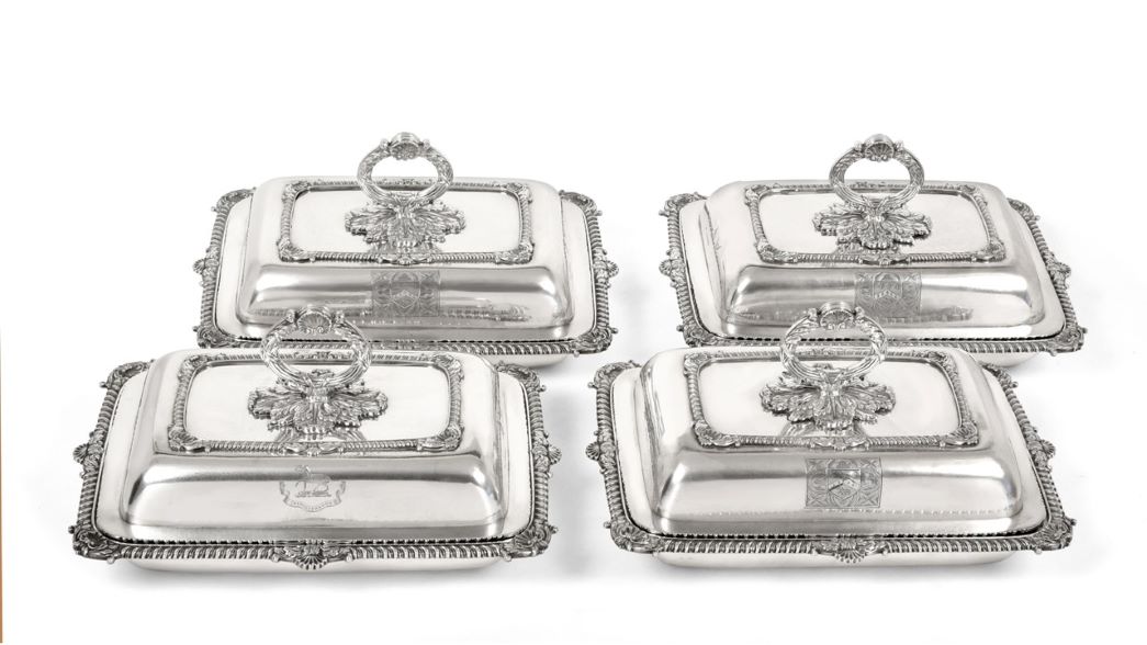 A good collection of silver is led by a set of four George III silver entrée dishes, probably made by William Stroud of London in 1816 (estimate: £5,000-8,000). Decorated with gadrooned borders and shell and acanthus leaf corners, the dishes are engraved with family crests and coats of arms. A strong selection of furniture is led by a fine George III satinwood and polychrome painted pedestal sofa table, painted with flower garlands and swags (estimate: £3,000-5,000), an ebonised, red tortoiseshell and brass-cut Bureau de Dame circa 1850 (estimate: £1,000-1,500) and a pair of French Louis XV style kingwood and giltwood metal mounted corner brackets (estimate: £2,000-3,000). Further highlights include a 19th century French ormolu six-branch candelabra in Louis XV style (estimate: £700-1,000), a Royal Worcester porcelain fruit study oval dish signed F Lockyer (estimate: £700-1,000) and a fine Edwardian Mahogany Tubular Bell Chiming Longcase Clock (estimate: £2,000-3,000).