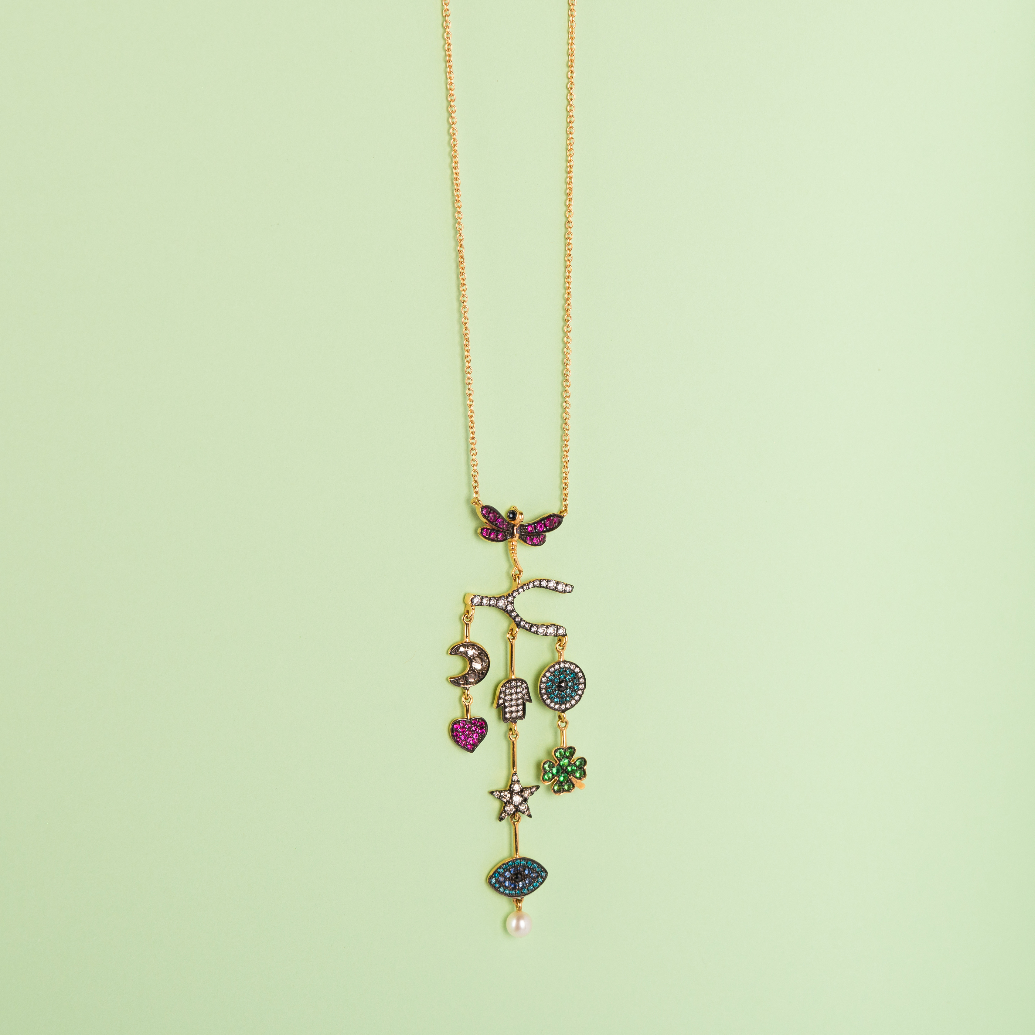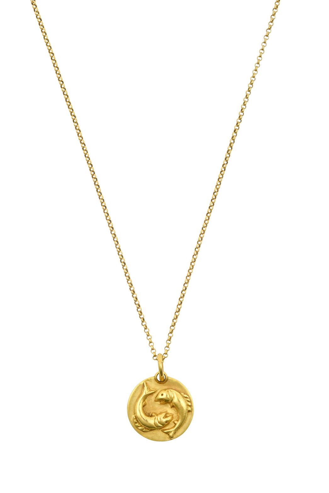 One of the notable lots by Annoushka in the sale is from their “Vampire’s Wife” range, a collaboration between Annoushka and Susie Cave, who founded the British fashion brand The Vampire’s Wife. Wife of Nick Cave, Susie took inspiration from his song lyrics. The 18 Carat Gold Vampire’s Wife Pendant on Chain is modelled as a hand with a ruby ring and is sold with both a chain and a red cord necklace (estimate: £250-300). Also from the Annoushka x Vampire’s Wife range and with a slightly more romantic feel is an 18 Carat Gold Vampire’s Wife Pendant on Chain, with a charm in the form of an envelope inscribed ‘SWALK’ and ‘LOVE LETTER’ (estimate: £250-300). The last two Annoushka lot in this sale are a Multi-Gem Set Chandelier Necklace, comprising several conjoined symbols, set with beautifully toned gemstones (estimate: £600-800), and an 18 Carat Gold Pendant on Chain, with the Pisces sign on a circular disc (estimate: £150-200).