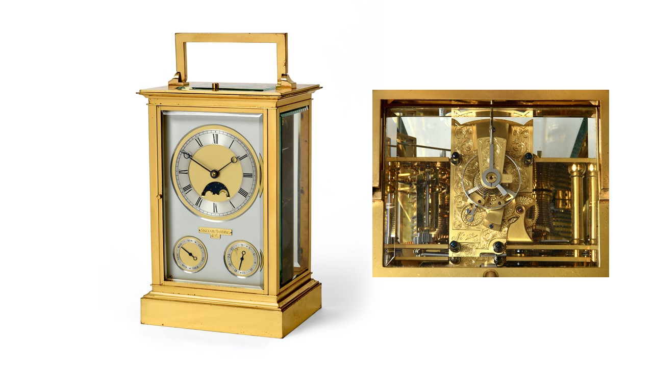 A rare and impressive limited edition Giant Chronometer Carriage Clock by Sinclair Harding is offered with an estimate of £6,000-8,000 (plus buyer’s premium). Of unusually large dimensions (stands at 41cm high), the clock was made circa 1998 and is marked as No. 554/22. Interesting features include a moonphase aperture and a platform detent chronometer escapement – marks of a quality precision instrument.