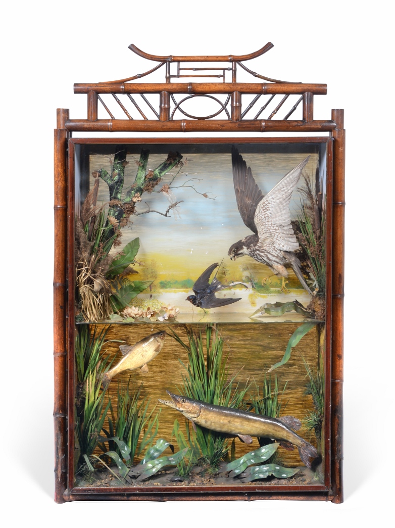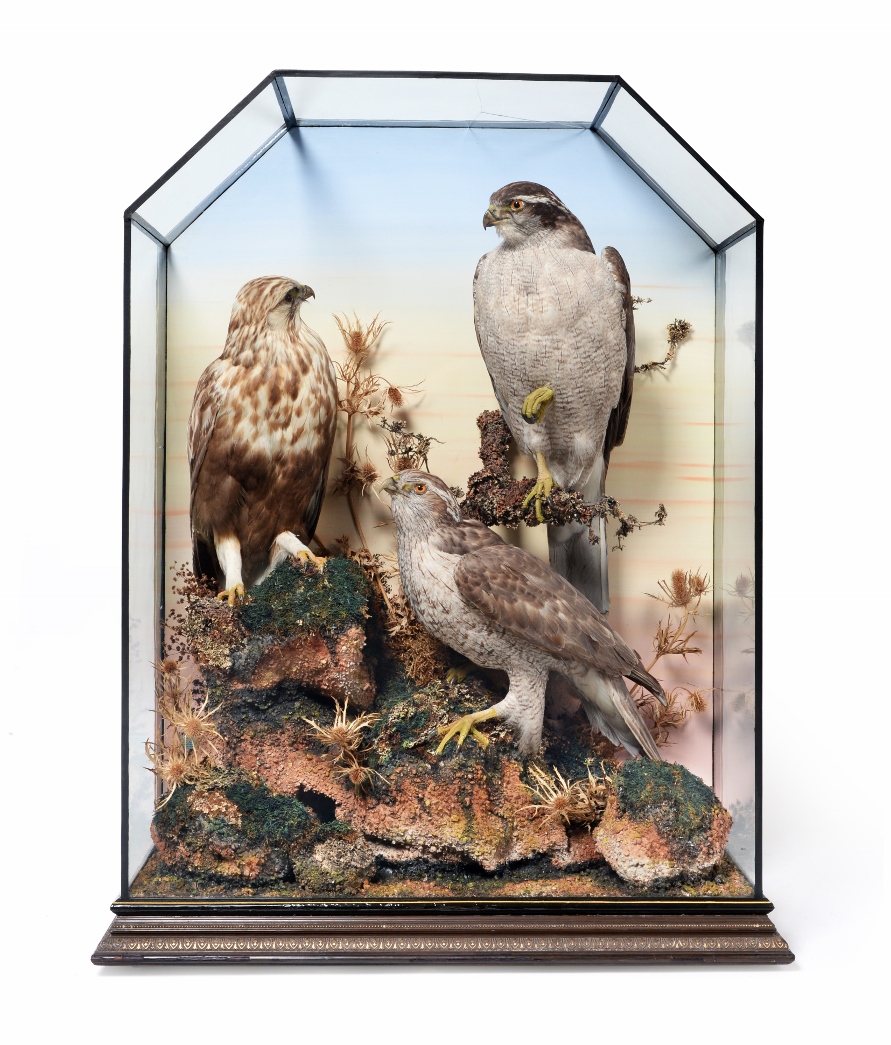 Mr Housden, a bricklayer by trade, would spend every weekend hunting fairs, auctions and antiques shops for the best examples he could find. Highlights from the collection include an extraordinary Victorian Fire Screen Diorama of Hunting Birds and Fish, made circa 1865-1880 by Ashmead & Co of London. In this highly realistic scene, a hobby chases a swallow, a dragonfly preys on a fly and a pike preys on a fish (Estimate: £2,000-3,000 plus buyer’s premium). Other superb lots include a very rare Late Victorian cased pair of Goshawks and Rough-legged Buzzard, 1835-1912, by James Birch Waters, (from London), Naturalist, Aboyne, Aberdeenshire (Estimate: £1,800-2,800 plus buyer’s premium).