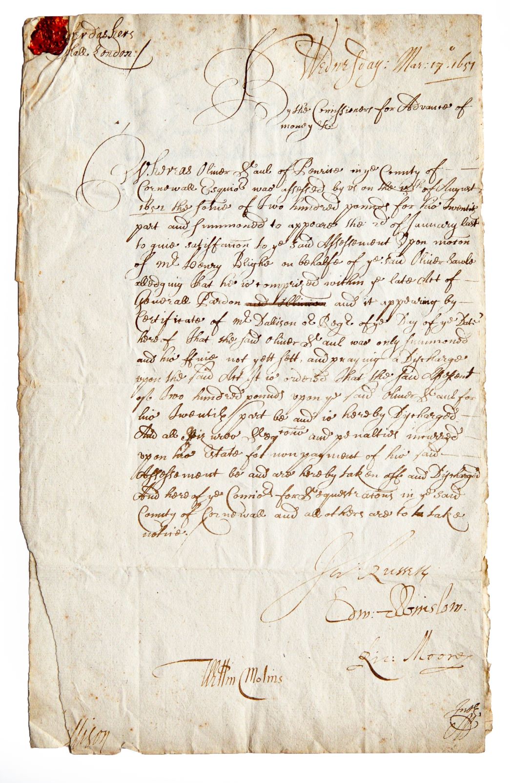 A central theme of the collection was the English Civil War, and the top lot of the sale was a group our forty-one Civil War Pamphlets, which sold for a surprise £16,000 (plus buyer’s premium) against an estimate of £400-600. Also selling well were a group of ten Yorkshire Civil War Pamphlets (sold for £3,800), and a letter from Sir Thomas Glemham (c.1594-1649) relating to the Siege of Carlisle in 1644 (sold for £2,000). The letter from the Royalist soldier and Commander-in-Chief of the four northernmost counties is thought to have been sent to Prince Rupert, and describes the siege, local opposition, and the difficulties in raising money for the subsistence of the Garrison.