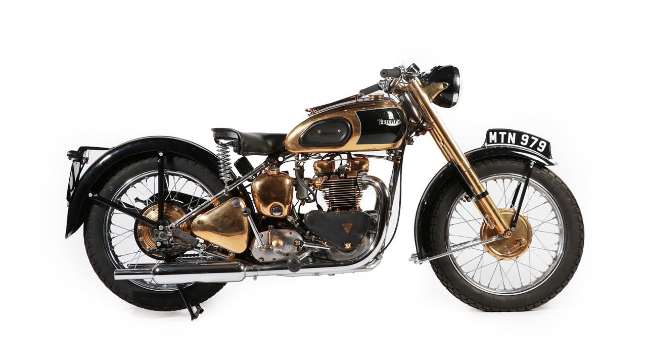 The Briggs collection comprises 15 cars, including a three-wheeled 1937 Morgan (£30,000-40,000), a 1920s Morris Cowley Tourer (£7,000-10,000), and a 1953 MG TD (£15,000-18,000), a group of twenty motorcycles such as a 1949 gold-plated Triumph t100 (£10,000-15,000) and various model of Norton and New Hudson bikes, and a selection of automobilia.