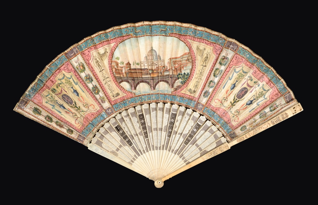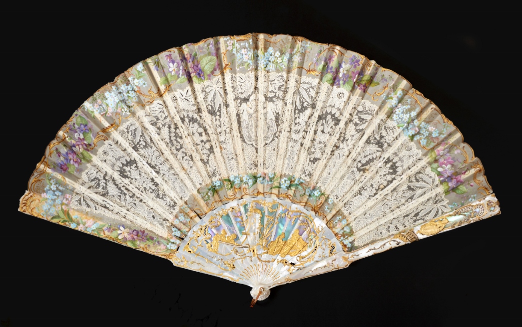 Highlights from the collection include a very fine and unusual Brussels lace fan, with gilded mother-of-pearl sticks (estimate: £1,200-2,000 plus buyer’s premium). The needlelace is of very fine quality and includes a coat of arms, said to be those of the Princesse Annie de Lusignan. A Grand Tour fan from the late 18th century depicting Rome, Pompeii and Herculaneum with a Chinese export monture, is offered with an estimate of £800-1,500 (plus buyer’s premium). The fan was once exhibited in the Brighton Art Gallery.