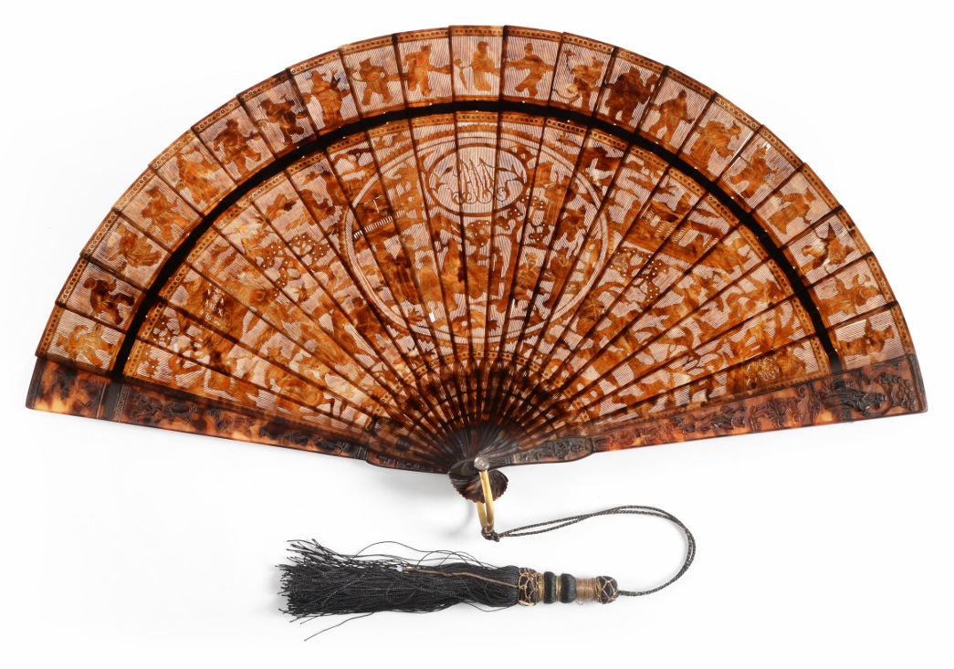 From the Far East is a circa 1840s Chinese carved tortoiseshell Brisé from the Qing Dynasty. Featuring carved scenes and the initials ‘MA’ the fan is offered with an estimate of £1,000-2,000 (plus buyer’s premium).