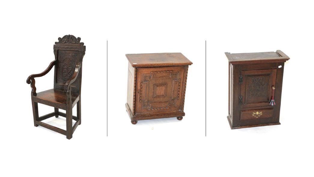Highlights from the collection include a good 17th Century Joined Oak Wainscot Armchair (estimate: £600-800). The back of the chair incorporates a panel carved in relief with flowers, serpents, and a moulded arch with pilasters. An 18th Century Joined Oak Wall-Mounted Mural Cupboard, initialled and dated WMT 1733, it is estimated at £400-600, and a 17th Century Oak Spice Cabinet is estimated at £300-500.