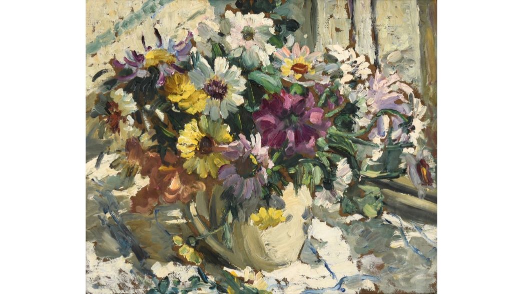 The floral theme continues with two still lifes by Dorothea Sharp, known for her naturalistic studies of children and landscapes. Her ‘Still life of Summer flowers in a white glazed jug’ and ‘Dahlias in a vase’ are both offered with an estimate of £5,000-8,000 apiece, and a limited-edition lithograph by Dame Elizabeth Blackadder of ‘Arum Lilies’ is offered with an estimate of £500-700.