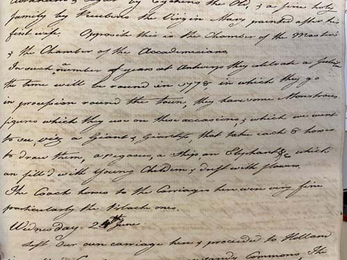 “In such a number of years at Antwerp they celebrate a Jubilee the time will be round in 1778, in which they go in procession round the town, they have some Monstrous figures which they use on these occasions, and which we went to see… a Giant and Giantess, that take each 8 horses to draw them, a Pegasus, a Ship, an Elephant and which are fill’d with young children and drest [sic] with flowers”.