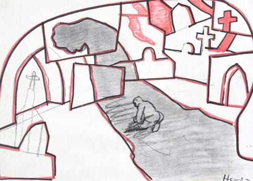 I would also visit Stephen Cox in his large studio in Kent, and whilst I had managed to get a wonderful watercolour by him of a series of heads of St Paul, when this sculpture came up, I couldn’t resist it. It was on a trip to New York that I was lucky enough to meet Francis Newton Souza. We had a memorable lunch in a New York diner and having known and loved the emotional intensity and rawness of his crucifixion painting in the Tate, I was thrilled when I had the opportunity to get this drawing from my friend Jane England.