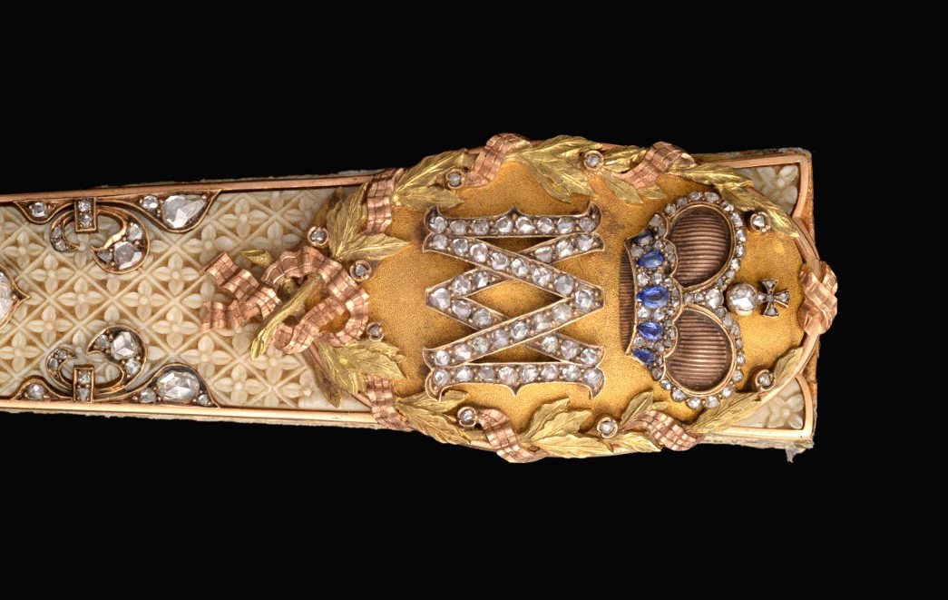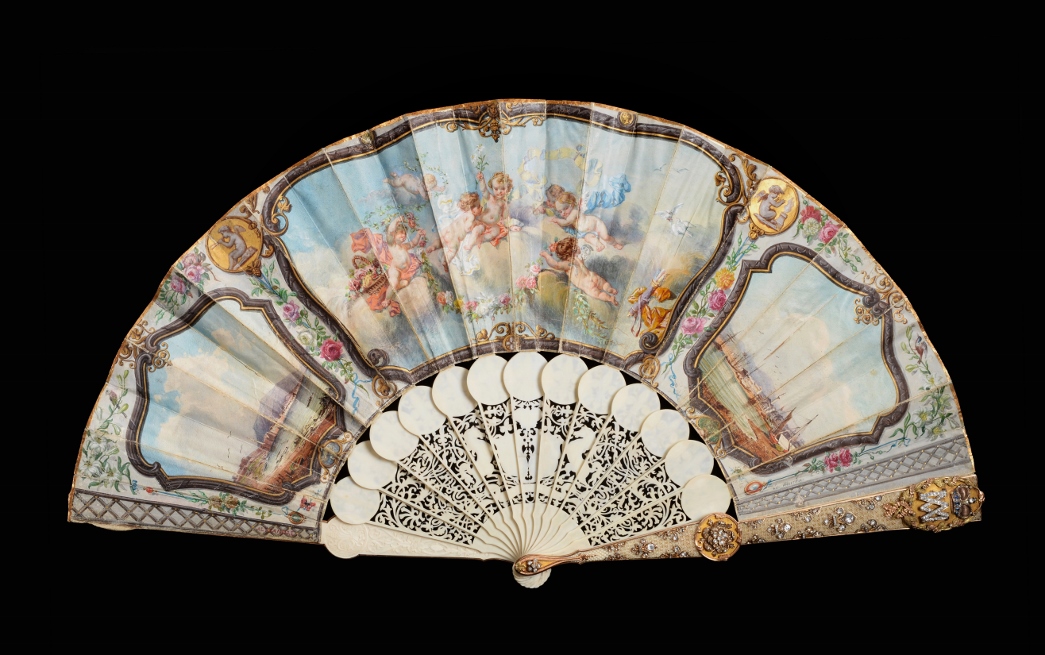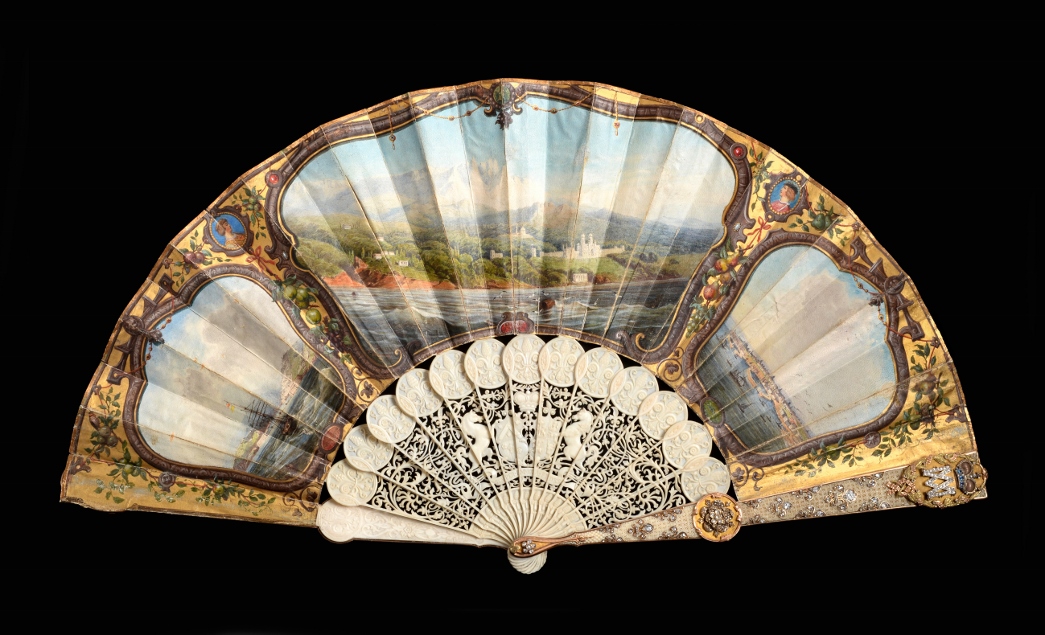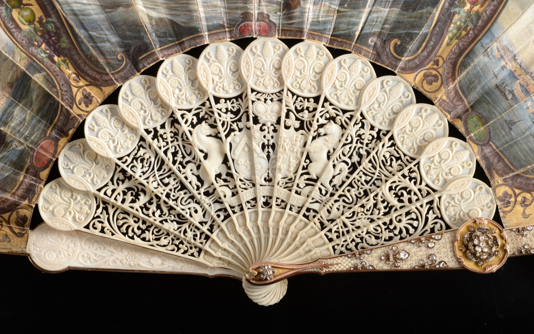 Estimated to sell at £30,000-50,000 (plus buyer’s premium), the fan has intricately carved ivory guards encrusted with pink, white and yellow gold, diamonds, sapphires and a coronet over the initials ‘WV’ picked out in diamonds. A coat of arms combining the arms of the two families is carved in the ivory gorge (sticks), with the motto ‘Semper Immota Fides’ (Always Unwavering Loyalty). The paper leaf is hand-painted with views of Odessa, Sebastopol and the Chateau d’Alhambra at Yalta (the Voronstov family’s palace), and the fan is signed by renowned fan-maker Alexandre and Edouard Moreau, one of the most sought-after fan painters.