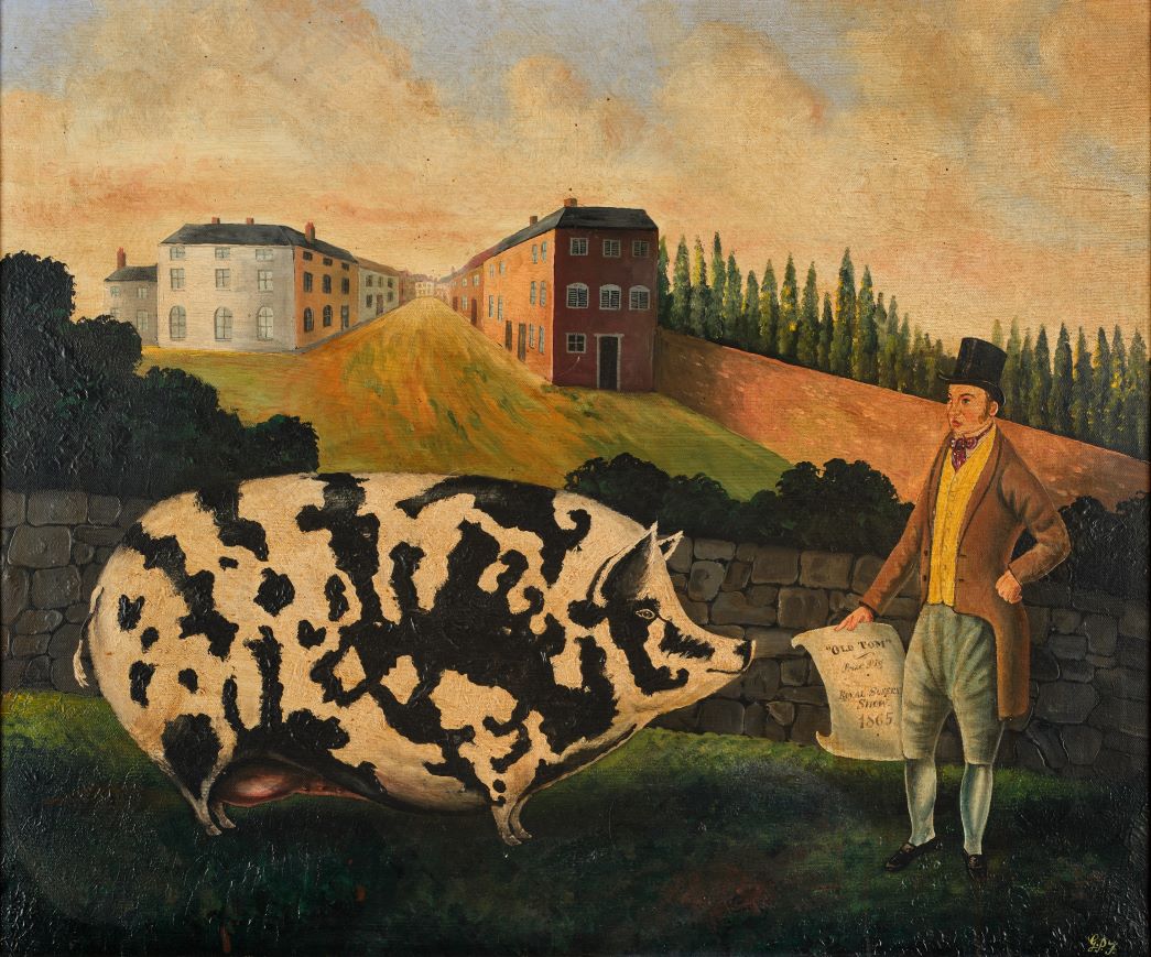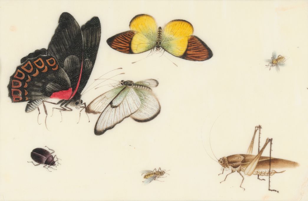 Perhaps some of the most charming pictures in the sale are pieces of English folk art, which include Portrait of a Prize Winning White Bullock in the Manner of John Boultbee, and a 20th century painting by ‘GPJ’ of “Prize Pig Old Tom, Royal Sussex Show, 1865” (estimate: £50-80). From further afield are numerous decorative Chinese School Pith Paintings of beautifully rendered insects, flowers and spiders, including a set of twenty-two offered with an estimate of £1,500-2,500.