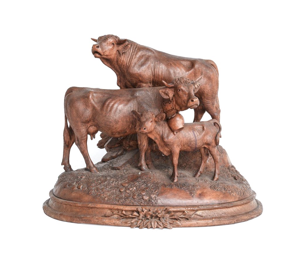 Alongside a good offering of 19th century samplers is a Mid-17th Century Stumpwork Picture, depicting a female figure in a cream dress (estimate: £2,000-3,000), and further highlights include a Continental School Portrait of G.Vallotier in the Late 16th Century Style (estimate: £400-600), a 19th century British School Portrait of Two Young Children (estimate: £500-800), and a Black Forest Carved Linden Wood Bull, Cow and Calf Group made by Johann Huggler in 1910 (estimate: £400-600).