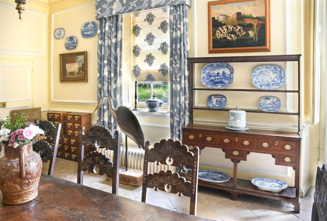 The collection was put together over several decades, and draws together good period oak furniture, folk art, 19th century samplers, and Asian art alongside modern and contemporary paintings, ceramics and works of art, many pieces with an animal theme.