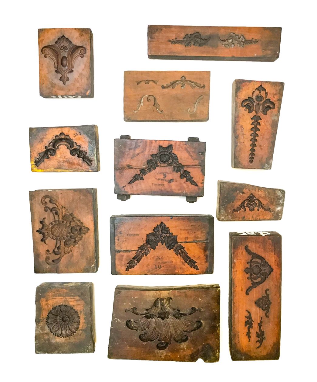 However, one of the highlights of the sale is a large private collection of 19th century moulds for frame making and decorative plaster work. The collection comprises nearly 140 wooden moulds, the majority made from boxwood, which will be sold in 12 lots and include intricate scrolls, cartouches and unusual motifs such as anchors and birds. In addition, several examples are stamped with the names of the craftsmen to which they once belonged. The collection also includes two rare brass drum stamps for making continuous bands of moulded decoration, a folio of 19th century picture frame patterns and mouldings, and an interesting archive of picture frame labels and trade cards.