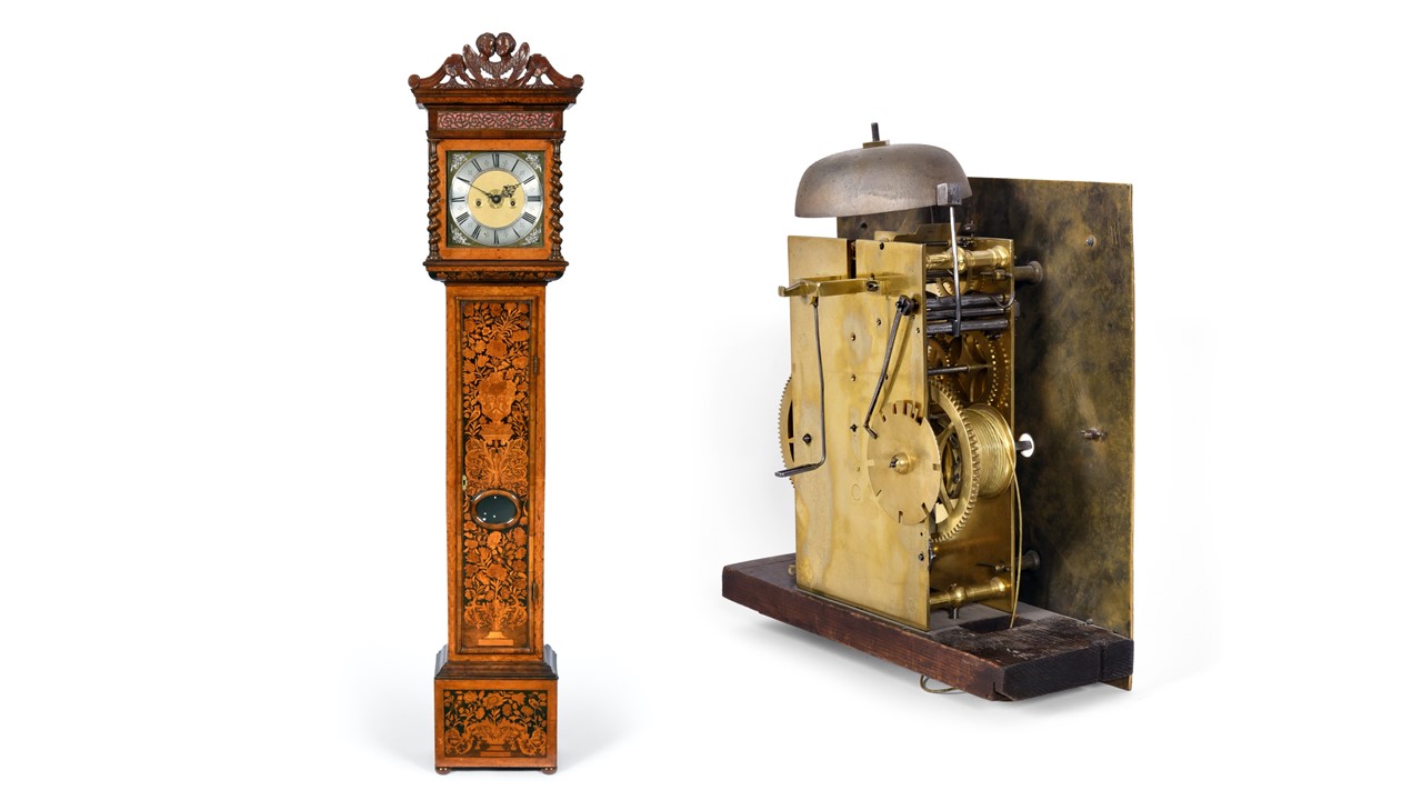 Three fine examples of clockmaking are amongst the highlights of the sale. The earliest is a rare Brass Striking Lantern Clock, signed ‘Richard Beck at Ye French Church, Londini, circa 1655’, and is offered with an estimate of £4,000-5,000 (plus buyer’s premium). Richard Beck’s career lasted just six years before he died at the early age of 27 in 1659, and only a handful of his lantern clocks are known today. All extant examples are finely made with excellent engraved dials with slight variations to the signature, the most common being ‘Near Ye French Church’ or ‘At Ye French Church’.