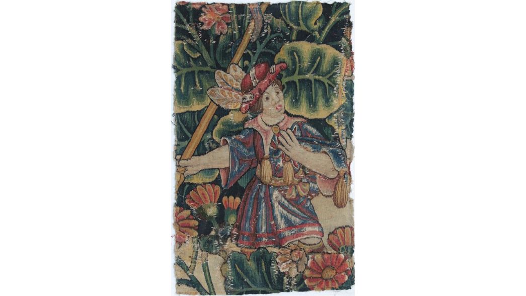Three 17th Century Flemish tapestry fragments in the sale comprise a silk and wool panel depicting a huntsman in a rich floral landscape (estimate: £450-550), a leafy swag with fruits and ribbons (estimate: £350-450), and a border fabric with exotic fruit and ribbons (estimate: £350-450).