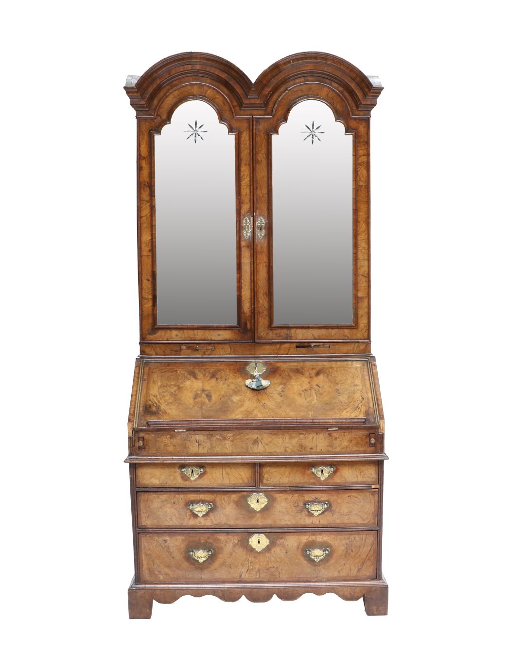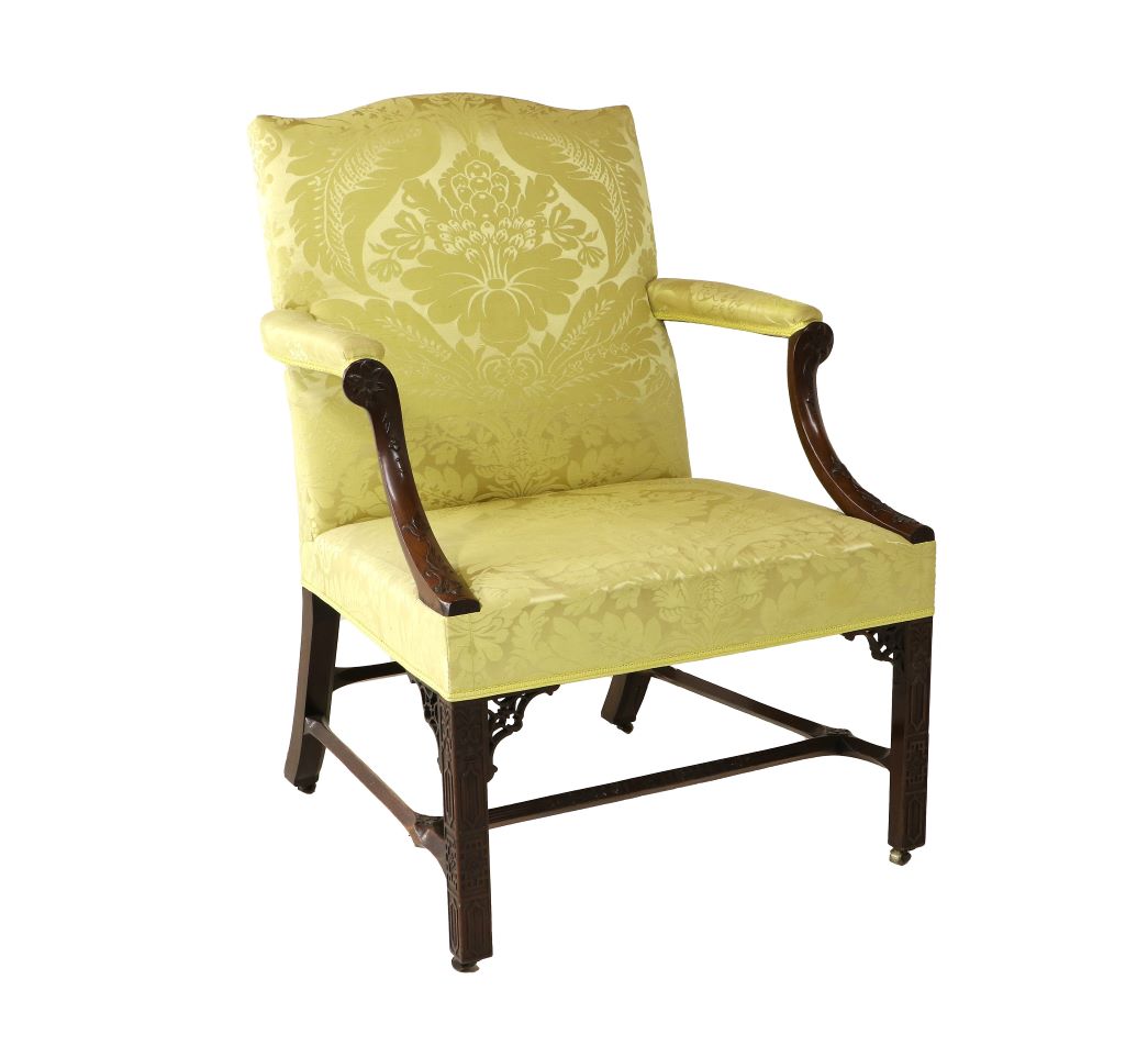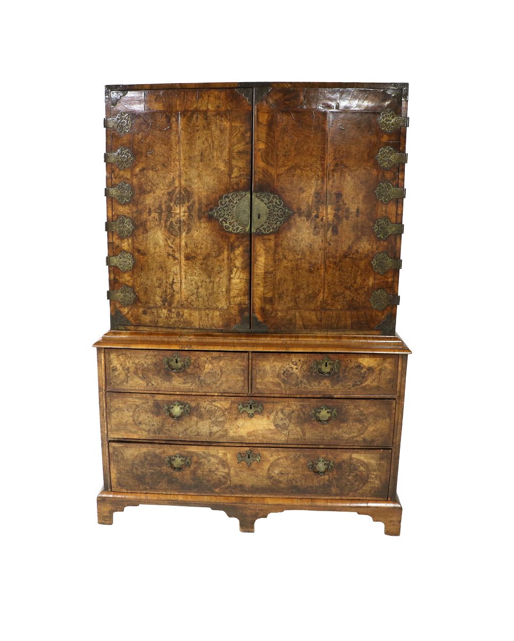 A good George I Figured Walnut and Featherbanded Bureau Cabinet, made in the early 18th century is offered with an estimate of £4,000-6,000, a George II Figured, Featherbanded and Brass Mounted Walnut Cabinet on Chest, second quarter of the 18th century is offered with an estimate of £3,000-5,000, and a George III Carved Mahogany Gainsborough Style Library Armchair is offered with an estimate of £3,500-4,500.