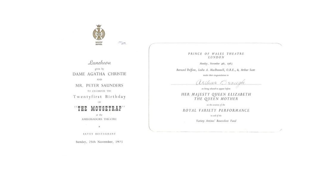 A small archive of theatrical ephemera that belonged to Arthur Brough (1905-1978), best known for his portrayal of Mr Grainger in the long running TV series ‘Are You Being Served?’ is coming up for auction in Tennants Auctioneers Toys & Collectables Sale on 10th June.