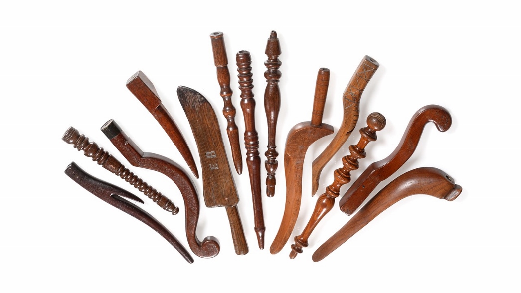 Also of note in the sale are a collection of knitting sheaths, many with provenance from the Yorkshire Dales, two lots of pretty 19th century children’s and dolls’ shoes and a collection of Charles Horner and other hat pins. A quantity of good lace including Irish tambour, Brussels, Honiton and Irish crochet sits alongside an array of costume from Victorian dress and buckskin breeches to 1920s and contemporary fashion by the likes of Alexander McQueen and Christian Lacroix. Luxury accessories will conclude the sale, with the likes of Gucci belts, bags by Burberry, Mulberry and Prada and Hermes scarves.